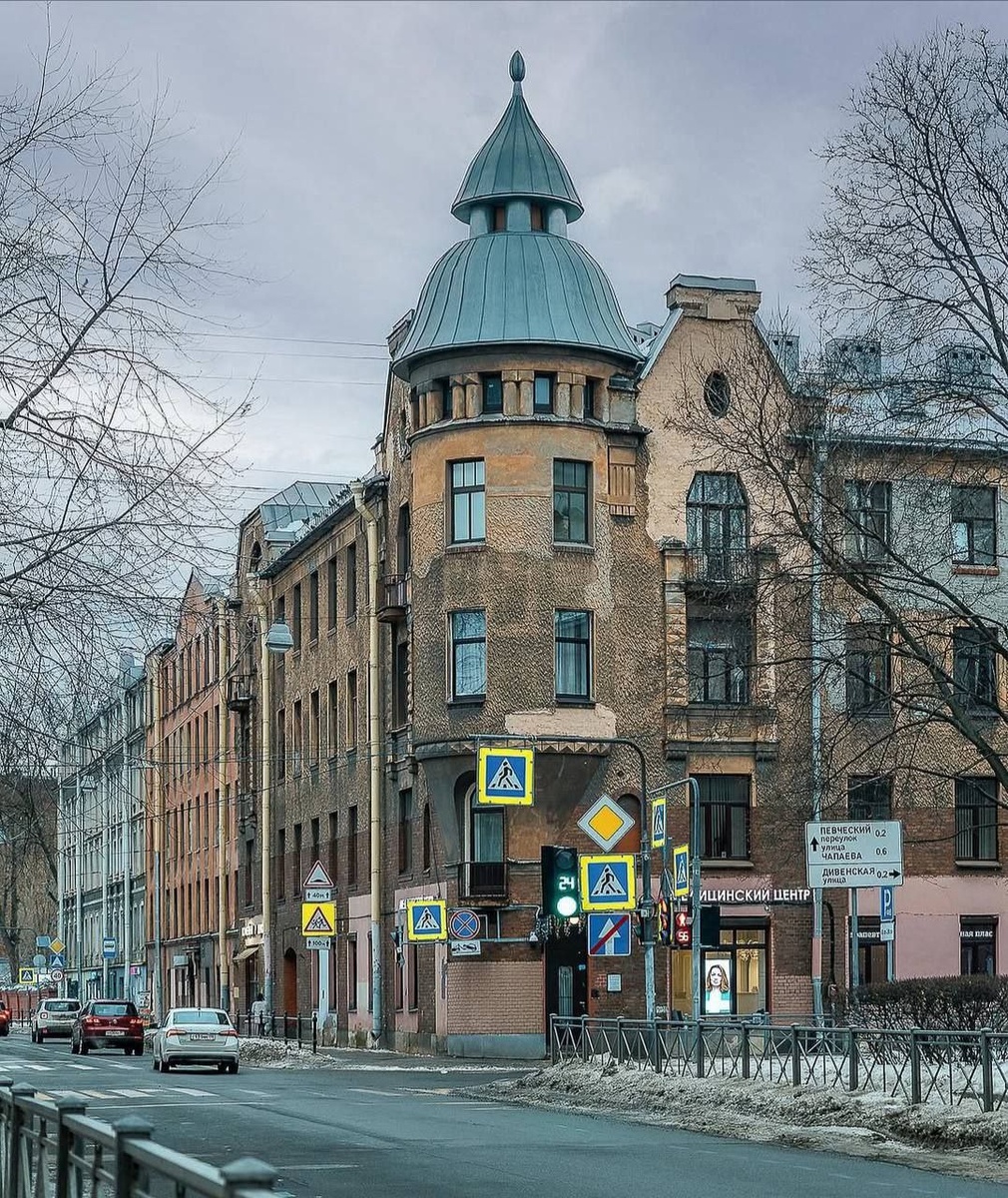😑 Дом построен в 1912 — 1913 годах по проекту Д. Д. Смирнова. 😑 Архитектурный облик здания украшают круглые угловые эркеры с двойными куполами, трапециевидные щипцы и псевдоэркеры с лопатками. 😑 В доме были устроены магазины и 4-5-комнатные квартиры. 😑 Подрядчиком черновых строительных работ выступал сам владелец. Штукатурные работы выполнил А. И. Иванов, столярные и паркетные — М. Л. Мухин, малярные — В. Е. Волков, слесарные и кузнечные — И. В. Палехов, а лестничные — И. К. Бредаль и И. Ф. Дорофеев. 📍 Дивенская ул., 14
