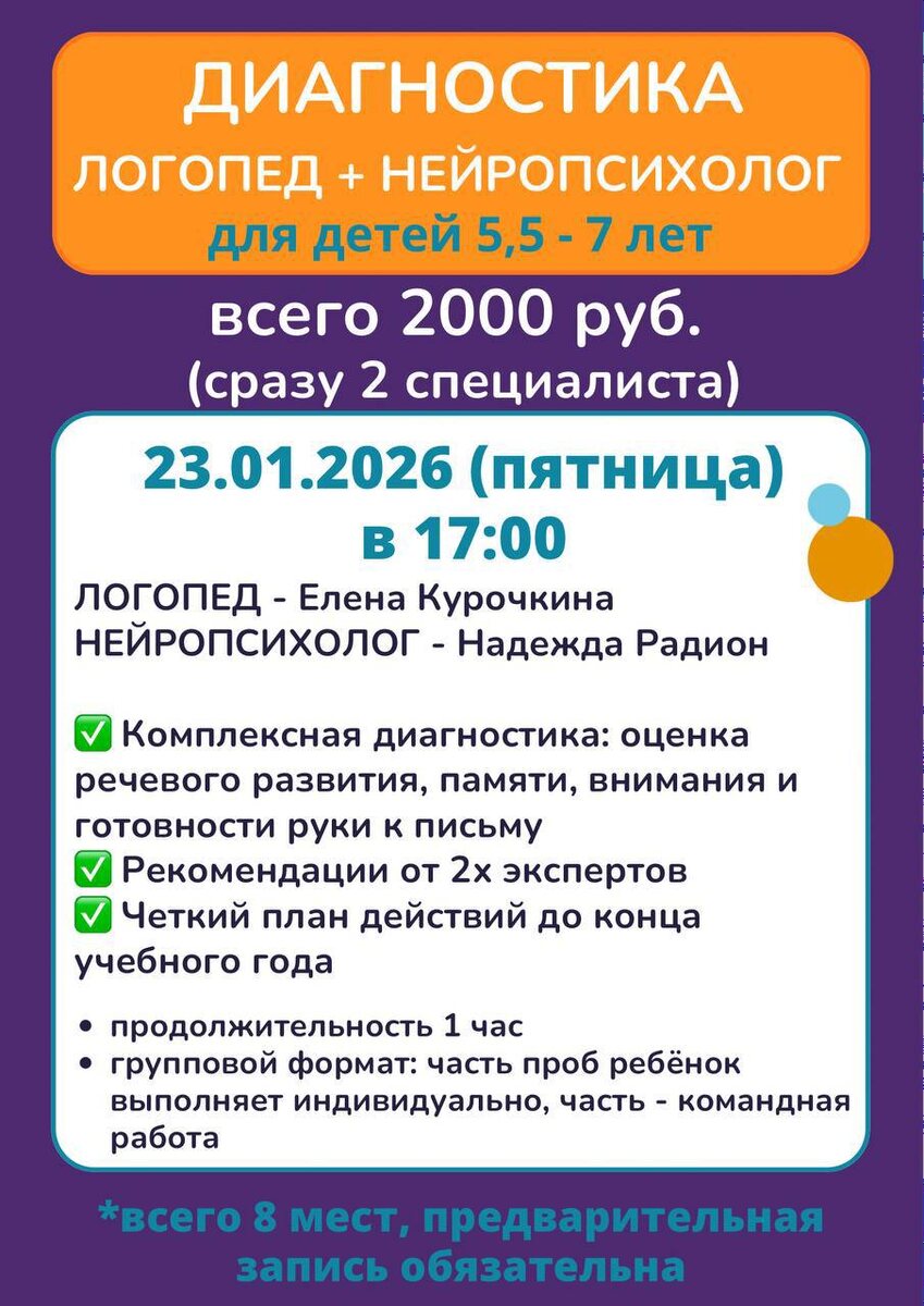 ! Приглашаем пройти КОМПЛЕКСНУЮ ДИАГНОСТИКУ для детей 5,5 — 7 лет Её проводят сразу 2️⃣ СПЕЦИАЛИСТА: 👉логопед-дефектолог Елена Курочкина 👉 нейропсихолог Надежда Радион За 1 час вы получите полную картину: ✅ Оценку речи, памяти, внимания и готовности руки к письму ✅ Комплексные рекомендации от двух экспертов ✅ Четкий план действий до конца учебного года Стоимость: 2 эксперта за 2 000₽🚀 🗓️23 января 17:00 📍Всего 8 мест, запись обязательна. Записаться на КОМПЛЕКСНУЮ ДИАГНОСТИКУ —> +7(931)590-92-10 Или в ТГ: @centreslovo