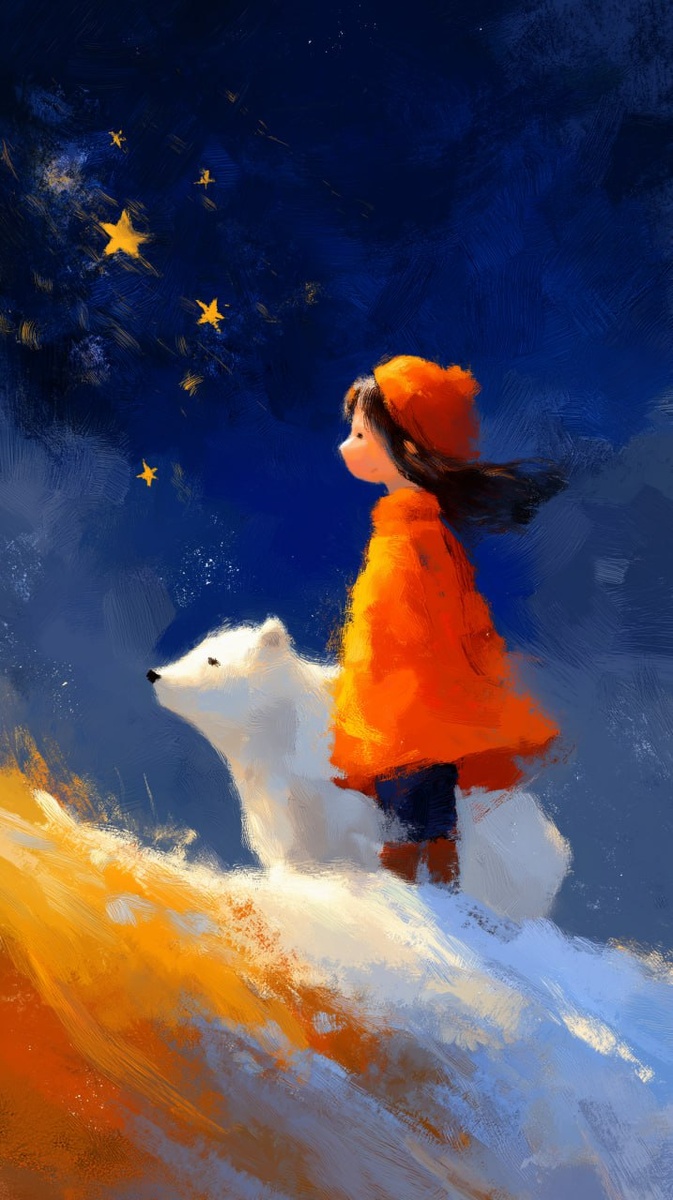 A cartoonish picture of a girl standing on a snowy hill joined by a polar bear, stars flying above them