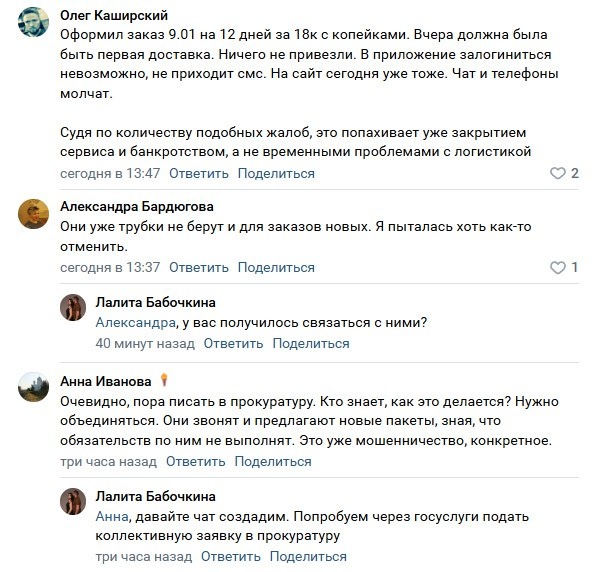 У сервисов доставки готовых рационов My Food и Level Kitchen массовые задержки заказов: пользователи пишут, что сроки сорваны, а достучаться