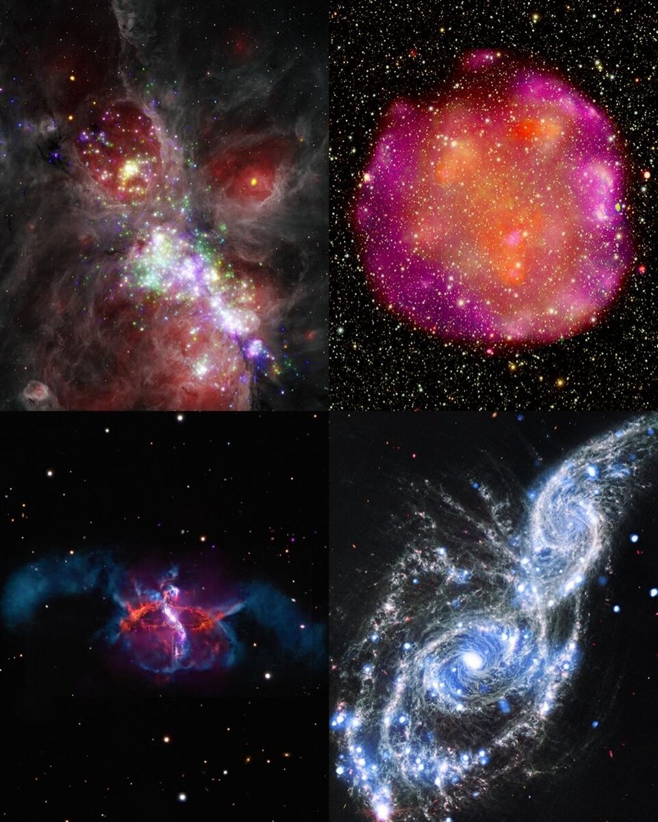 Уэбб, Хаббл и других телескопов. Это четыре композитных изображения, каждое из которых объединяет рентгеновское излучение с инфракрасным и оптическим. Факт: рентген фиксирует плазму температурой 10^7 K от ударных волн сверхновых, невидимых в видимом свете. В верхнем левом углу — NGC 6334, где пылевые и газовые карманы напоминают осенние листья, развеянные ветром молодых звезд. Скопление содержит сотни протозвезд массой до 20 солнечных. Факт: скорость ветров здесь достигает 1000 км/с, формируя пузыри радиусом 1 световой год. Другие изображения включают R Aquarii — симбиотическую систему с двойной звездой, где рентгеновские джеты формируют "пушистые рукава". Факт: такие системы пульсируют с периодом 387 дней, выбрасывая материал на 10^15 см ежегодно.
