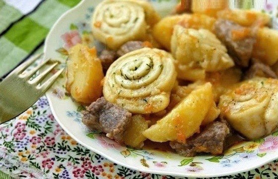 7. Как картошка будет готова, укладываем сверху нудли (если воды мало — подлейте, попробуйте, может, нужно подсолить). Накрываем крышкой и тушим на самом маленьком огне минут 15.