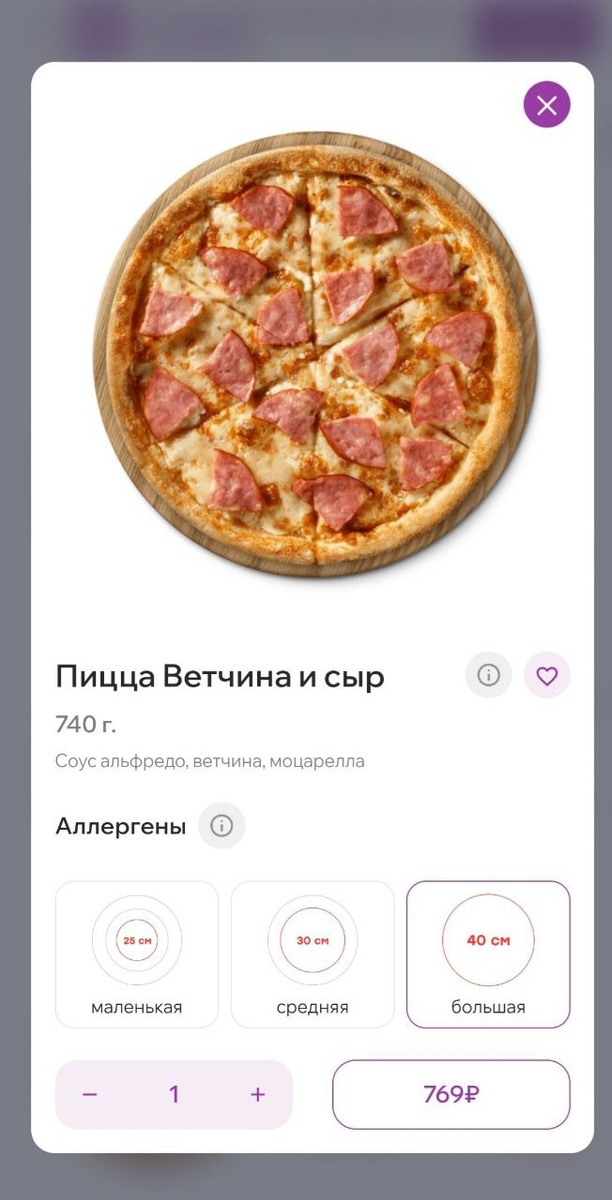 Выбрали аппетитную по фото - с ветчиной и сыром, самую большую, в диаметре 40 см, детям нравится такой формат, коробка размером со стол.