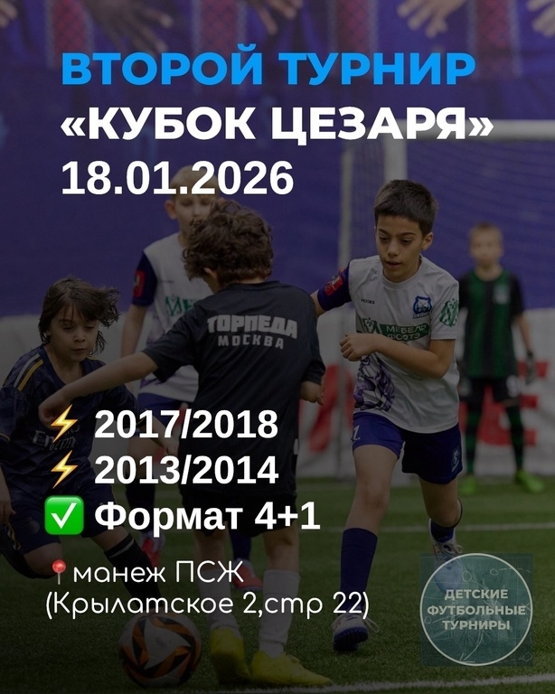 ⚡⚡⚡ ВТОРОЙ ТУРНИР В ЭТОМ ГОДУ 🏆 «КУБОК ЦЕЗАРЯ» 18.01.2026 📆 🙌 ТУРНИР ДЛЯ КОМАНД НАЧАЛЬНОГО И СРЕДНЕГО УРОВНЯ ПОДГОТОВКИ ✔2017/2018 года рождения ✅Формат 4+1 ✔2013/2014 года рождения ✅Формат 4+1 ⏰Минимальное игровое время на турнире 60 минут 🏟В этом сезоне мы проводим наши турниры в новом улучшенном манеже Москвы! ⚽Так же игры будут проходить на ДВУХ полях, что значительно увеличит интенсивность и пауз станет намного меньше! 🏅Обновленные награды, уникальные медали, новые номинации и многое другое ждет ребят на турнирах! Награждается каждый участник игр! 📸 На каждом турнире работает фотограф, который сможет сделать снимки лучших моментов игр и награждения! Так же каждый турнир проходит с музыкальным сопровождением и с праздничным настроением 🅿 Для родителей доступна бесплатная парковка, а так же кафе на территории манежа! 📍 Место проведения турнира: Арена ПСЖ Крылатская ул., 2, стр. 22 https://yandex.ru/maps/org/novy_futbol/30973504524?si=czwp64mmrdxptw7tu8u4h3fabm По