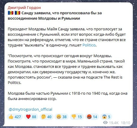 Которая воспользовалась слабостью Советской власти и отмела по-тихому то, что ей не принадлежало. В 1940-м году тов. Сталин пошевелил бровью, и мамалыжники, низко кланяясь, вернули всё взад. Сейчас происходит ровно то же самое - продажная элита готовится за долю малую продать страну соседям. Не понимают главного, дебилы: если до сих пор есть еще хоть какая-то вероятность вернуть Приднестровье в состав единой страны, то в случае присоединения к Румынии вероятность этого будет равна нулю. А в довесок еще и Гагаузия встанет и выйдет вон. 🐶 Подпишись на Шарика! Гав!