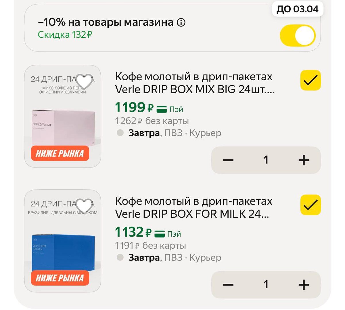 * 11г. https://market.yandex.ru/cc/8WUzfv Цена с промо 975PXGPX 👆 😃😃🤐🤐Кофе молотый в дрип-пакетах Verle DRIP BOX MIX BIG 24шт. * 11г. https://market.yandex.ru/cc/8WV27R 🛍 JANU55-AF - Скидка 100 ₽ на один любой заказ при покупке от 5000 ₽ ✅ Канал по скидкам 🔣 Бот с промокодами