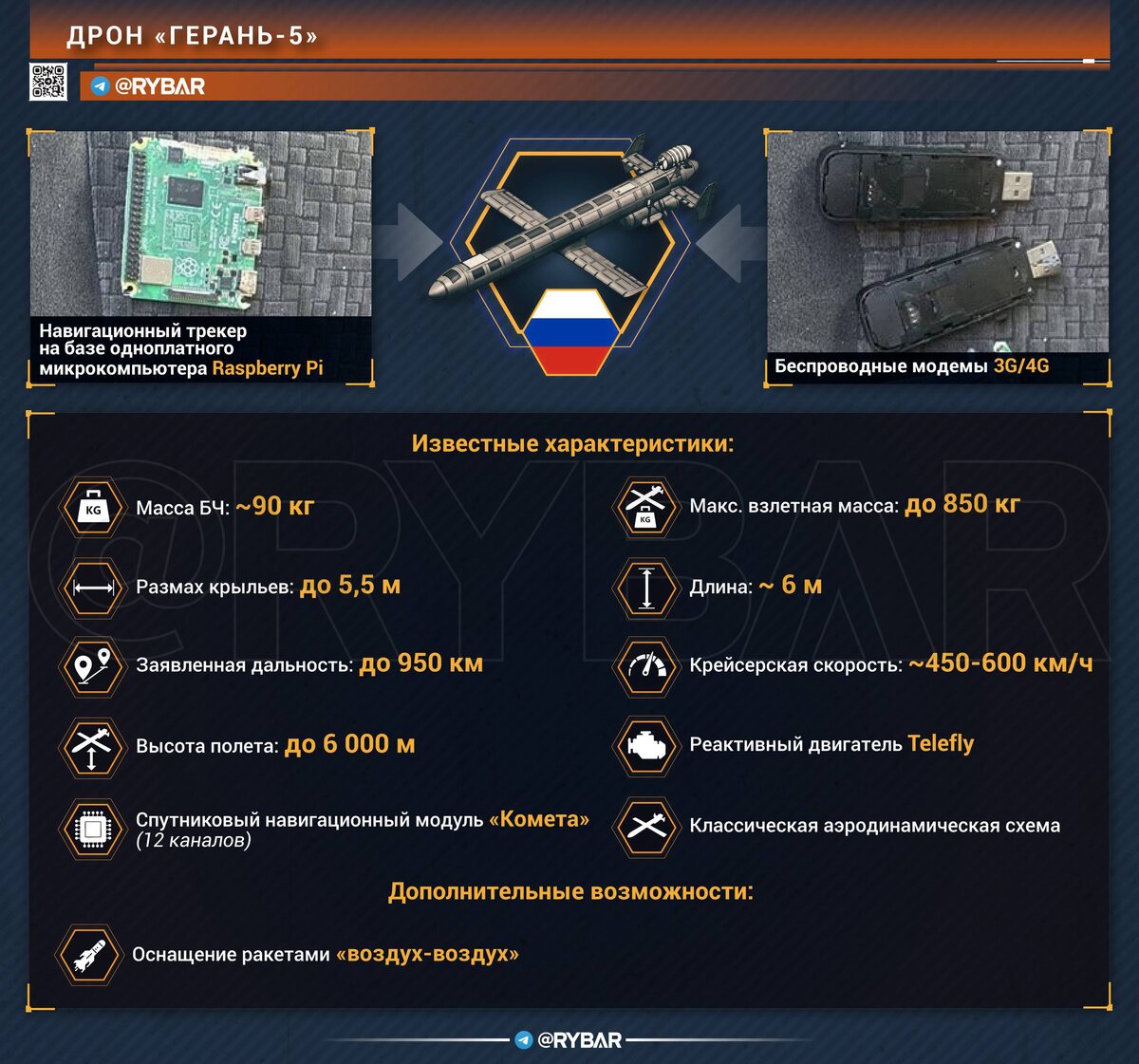 Эволюция российских ударных БЛА продолжается: в Сети появились кадры обломков нового дрона, который в отчетах противника фигурирует как «Герань-5». Он выполнен по нормальной аэродинамической схеме и оснащен улучшенным вариантом реактивного двигателя Telefly, который уже встречался у «Герани-3». 🔸В документах ВСУ упоминается возможность оснащения дронов ракетами «воздух — воздух». Ранее их уже ставили на «Герань-2», и — по некоторым данным — на их счету уже есть сбитые вертолеты противника. 🔸На новый беспилотник установлен 12-канальный модуль спутниковой навигации «Комета» и трекер на основе компьютера Rasberry Pi. Управление также может вестись с помощью 3G и 4G сигналов через мобильную сеть, что уже было реализовано на других аппаратах. 🔸При всех внешних различиях новый БЛА во многом унифицирован с другими типами «Гераней», что облегчает наращивание производства и позитивно сказывается на цене изделия. Появление «Герани-5» свидетельствует об активном поиске пути расширения ударных