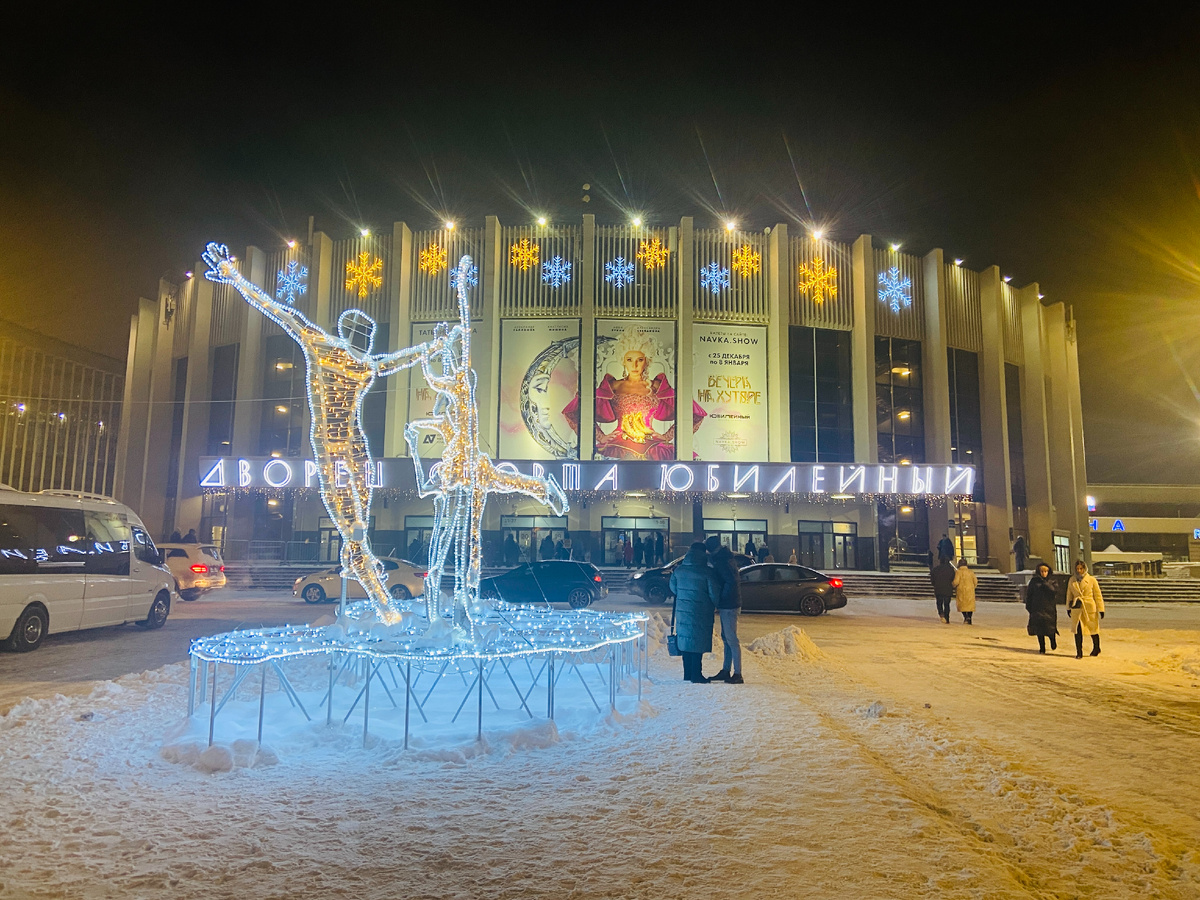 Новогодние каникулы у меня были довольно активные, и сегодня я хочу вам рассказать про ледовое шоу Татьяны Навки, которое я посетила в эти дни. Проходило оно в петербургском спорткомплексе «Юбилейный» (пр. Добролюбова, д. 18, станция метро «Спортивная»). Елочка рядом с комплексом. Чуть вдали виден Князь-Владимирский собор (архитектор Антонио Ринальди). Внутри комплекса фотографировать не стала, там всё типично для подобных мест: входная зона, зал ожидания, несколько точек питания, туалеты. В холле было много людей, можно было купить сувениры, выпить кофе или перекусить перед началом мероприятия. Зашли в зрительный зал, на сцене были уже выставлены декорации, позади размещен большой мультимедийный экран. Наши места были на 9 трибуне, 10 ряд. В основу спектакля легли известные повести Николая Гоголя, знакомые многим с детства. Шоу начинается. Николай Васильевич Гоголь выступает в роли рассказчика. Огромное перо опускается на лёд, а из динамиков звучит проникновенный голос Константина Хаб