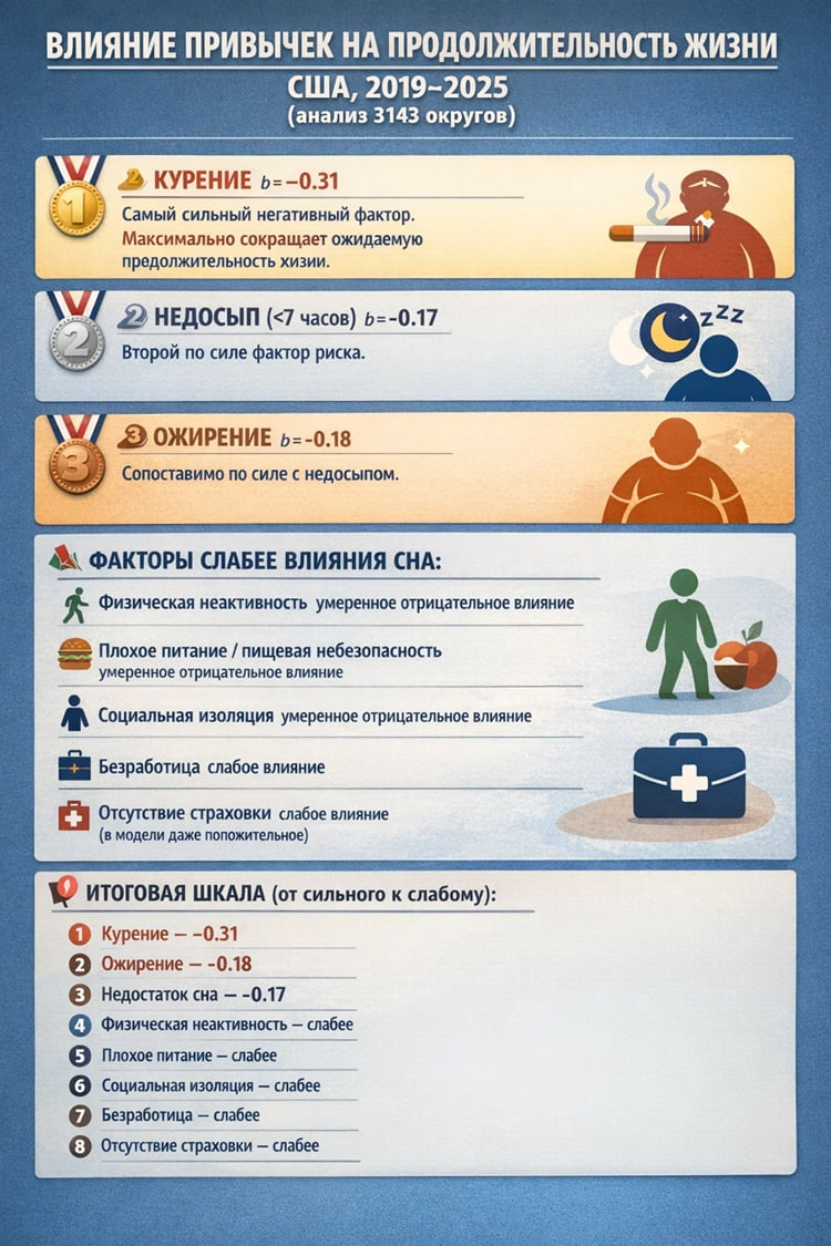 Телеграм канал Психологических исследований Суть в одной фразе: недостаток сна влияет на продолжительность жизни почти так же сильно, как курение — и сильнее, чем ожирение, диабет, бедность или отсутствие страховки. Американские исследователи из Oregon Health & Science University проанализировали данные 3143 округов США за 2019–2025 годы, чтобы понять, как недосып связан с продолжительностью жизни. Это одно из самых масштабных исследований сна и смертности на уровне локальных сообществ. Учёные использовали данные CDC BRFSS — крупнейшего национального опроса о здоровье. Для каждого округа оценили: ▪️долю людей, спящих <7 часов; ▪️среднюю продолжительность жизни; ▪️уровень курения, ожирения, диабета, физической активности, образования, безработицы, страховки и др. Далее применили линейные смешанные модели, чтобы учесть вложенность данных: годы → округа → штаты. ▪️3143 округа США ▪️данные за 7 лет ▪️миллионы респондентов ▪️анализ по каждому штату и по всей стране 1️⃣Недосып почти везд