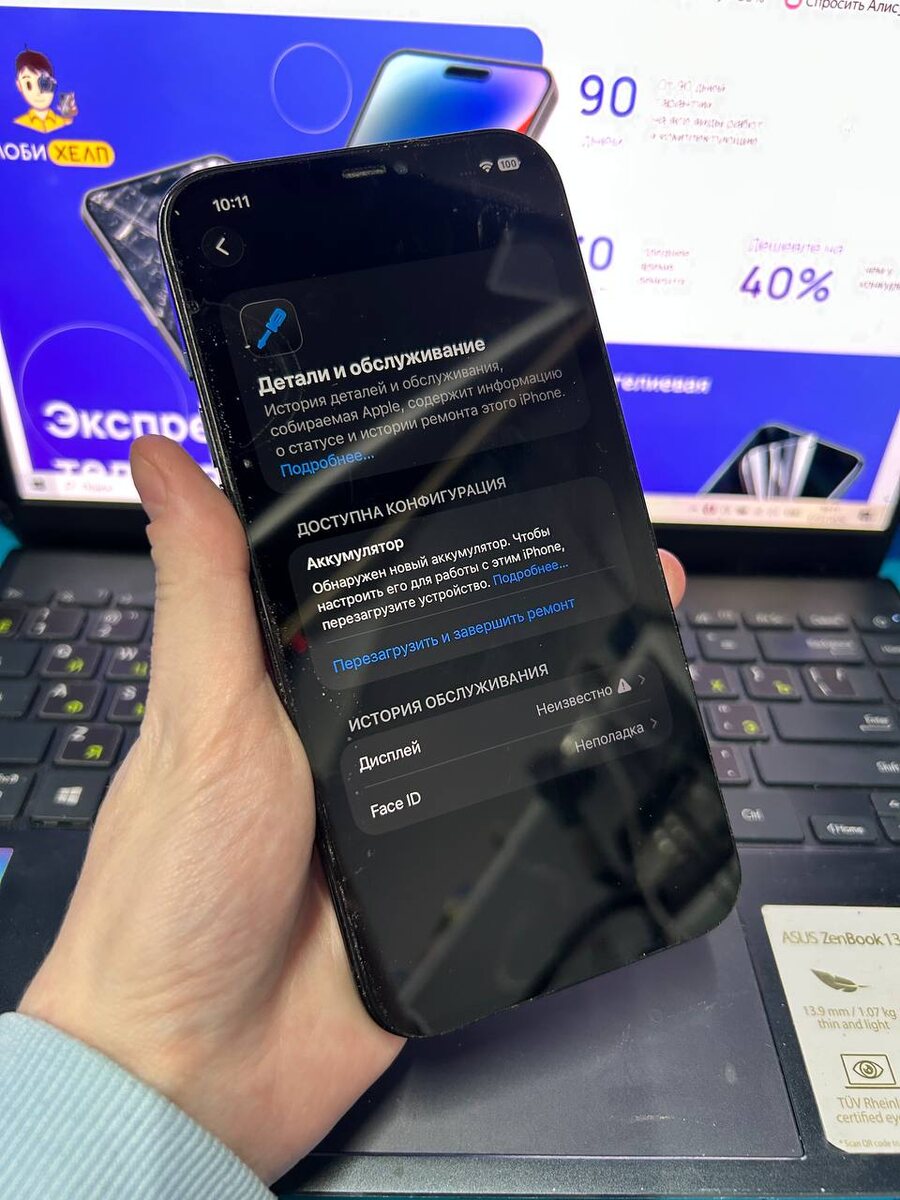 🔴Заменили АКБ в другом сервисе, перестал работать Face ID 🔵Выполненные работы: Предположение что при замере АКБ, порвали верхний шлейф дисплея и заменили на другой, из за чего перестал работать Face ID -Заменили на новый шлейф, получили заводские ключи разблокировки для чтения серийных номеров методом unbound , поставили новый шлейф с родными серийными номерами чтоб телефон мог работать с этим новым шлейфом #iphone12promax #восстановлениеfaceid #мобихелп #березовский