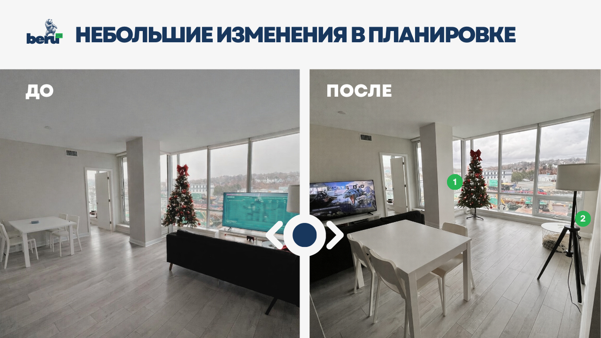 Иногда небольшие изменения в планировке комнаты кардинально меняют ощущения от пространства — и даже позволяют организовать дополнительные функциональные зоны. Помимо перестановки мебели и возможности любоваться панорамными окнами с видом на пристань, после разбора ёлки мы добавили рабочее пространство (1), а рядом с торшером разместили стильную тумбу с проигрывателем для пластинок (2). Когда наше видение и ощущение уюта распространяются по всему миру — это бесценно. 💙 Данный проект был реализован для семейной пары в Канаде. #допосле