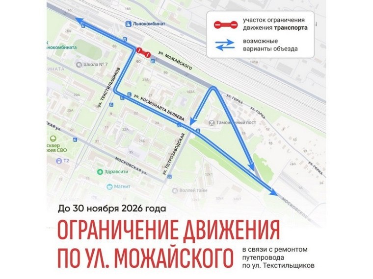 Проезд запретили из-за капитального ремонта моста на улице Текстильщиков. Об этом сообщили в Администрации областного центра. Напомним, движение ограничили 16 сентября прошлого года. Тогда местные власти заявляли, что проехать нельзя будет до 30 декабря. Однако сегодня сообщили о новых сроках. Так как часть работ проходит над проезжей частью, то в целях безопасности ограничение движения по ул. Можайского в районе дома №90 продлено до 30 ноября 2026 года. Перекрытый участок автомобилисты могут объехать по смежным улицам. Возможны следующие маршруты: Можайского — Петрозаводская — Беляева — Текстильщиков — Можайского (в обоих направлениях) или Текстильщиков — Беляева — Московское шоссе. Пешеходы могут обойти закрытый участок через двор дома №90 на ул. Можайского. Полную реконструкцию створа улицы Текстильщиков планируют завершить в декабре этого года. Капитально отремонтируют инженерное сооружение, а также смонтируют пандусы и подъёмники для маломобильных граждан. Обустроят тактильную