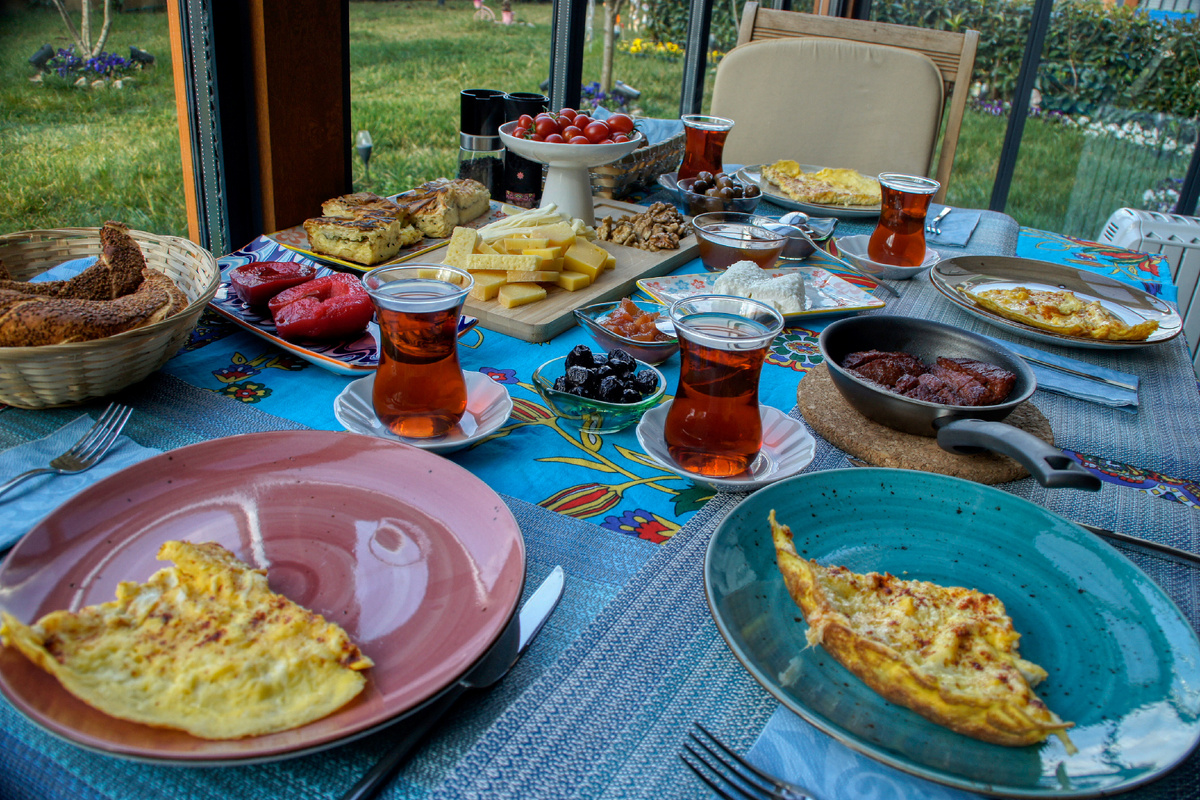 Турецкий завтрак часто удивляет тех, кто видит его впервые: десятки тарелок, простые продукты, отсутствие «главного блюда» и ощущение, что еда — лишь часть процесса. Это потому, что турецкий завтрак — не про калории и не про эффектность, а про образ жизни. Он отражает региональную экономику, семейную культуру и представление о правильном начале дня — в кругу семьи, за неспешными разговорами и смехом. 🕰️ Завтрак в Турции может длиться до 2 часов — и это считается нормой, а не роскошью. Основу турецкого завтрака составляют продукты ежедневного потребления, а не редкие деликатесы. На столе почти всегда есть несколько видов сыра (бейаз пейнир, кашар, тулум), оливки как минимум двух типов, свежие овощи, яйца, хлеб и оливковое масло. Важная деталь — региональность: сыр из Вана отличается от эгейского, оливки с Эгейского моря — от черноморских, а мед с каймаком меняется от провинции к провинции. Основные ингредиенты: 🧀 Сыры — beyaz peynir, kaşar, tulum 🫒 Оливки — черные и зеленые 🍅 Овощ