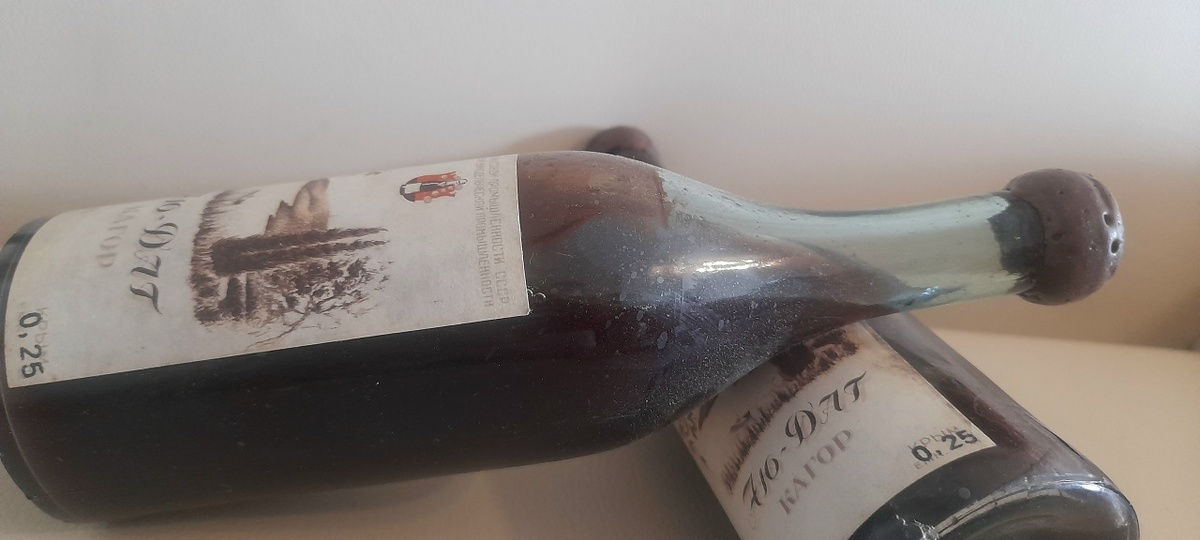 Данный тип этикеток (без указания объема) принадлежит к министерству вкусовой промышленности СССР(1946-1948 года) сургучная укупорка с обозначением принадлежности к МВП СССР ГУВП и был использован для четырёх разновидностей розлива,а именно: