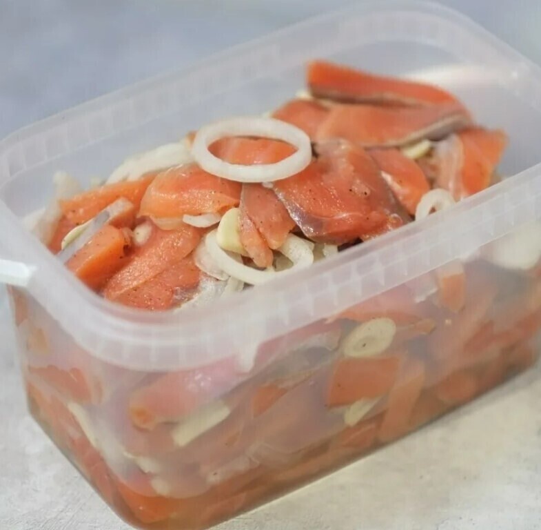 Укладываем куски рыбы в контейнер или любую глубокую емкость.