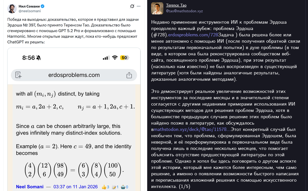 Это значит, что ИИ уровня «гений по требованию» может появиться уже в 2026 Сегодня многие медиа напишут, как о сенсации, о «победе на выходных: ChatGPT 5.2 Pro решил нерешенную ранее математическую задачу». Речь идет о сообщении Нила Сомани, что доказательство, которое он представил для задачи Эрдёша № 397, было принято знаменитым математиком Теренсом Тао. FYI. Знаменитый венгерский математик Пал Эрдёш сформулировал множество нерешённых гипотез и задач в математике (более 1000), в основном в областях комбинаторики, теории чисел и геометрии. Многие из них до сих пор не решены. И хотя в сообщении Нила Сомани чистая правда, сенсация вовсе не в этом. Настоящая сенсация в том, что произошел какой-то еще не понятый нами прорыв. Фронтирные модели вдруг начали с конца декабря щелкать одну за другой нерешенные людьми задачи Эрдёша, тратя на решение одной задачи около15 минут: 24-го декабря решена задача №1077; 25-го - №333; 26-го – 897; 6 января 2026 - №728; 8-го – 720; 10-го №205 и №397 (источ
