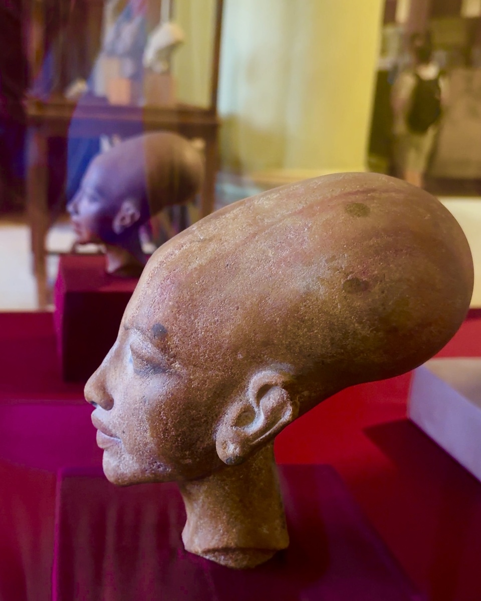 Когда я бродила по многочисленным залам Каирского музея, то мой взгляд приковали фигуры с очень странной формой черепа. Вы только посмотрите сами! И естественно, мне было интересно узнать, кто изображен. И с чем может быть связана такая форма головы. Первый вопрос достаточно однозначный: это дочери фараона Эхнатона (Аменхотепа IV). Кстати, он предположительно отец фараона Тутанхамона. А мама этих дочерей - небезызвестная Нефертити. Как вы можете судить по его скульптуре, внешность и фигура у него тоже весьма интересная: женские признаки и вытянутое лицо. А вот почему у них были такие внешние данные - здесь уже множество версий. Давай попробуем разобраться. Важно сразу разделить два аспекта: реальную антропологию и художественный стиль. Сама практика вытягивания головы существовала в разных культурах мира (древняя Месопотамия, некоторые культуры Южной Америки, позднеантичная Европа). В Древнем Египте были обнаружены единичные случаи искусственно деформированных черепов, но они относятся