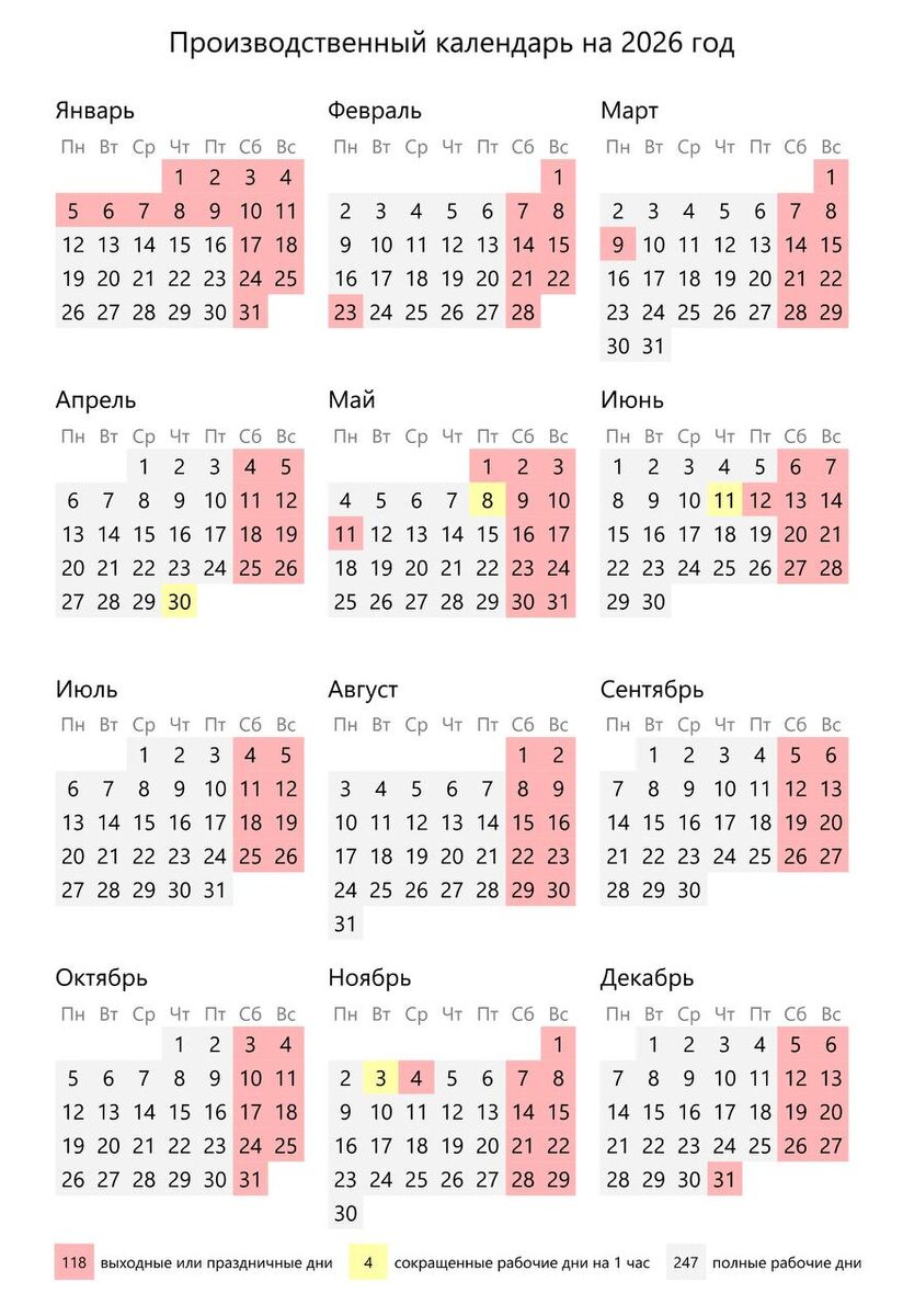 В 2026 году при стандартной пятидневной рабочей неделе нас ждут 118 выходных и нерабочих праздничных дней