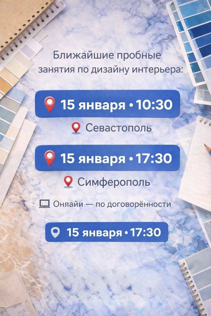 С одной стороны - «надо начинать». С другой - всё ещё хочется отложить. Очень часто желание попробовать что-то новое упирается не в отсутствие времени, а в сомнение: а получится ли у меня? а не поздно ли? а вдруг это не моё? Мы видим это каждый день. И именно поэтому в Академии есть пробные занятия. Не для того, чтобы сразу решать. А чтобы: — прийти — посмотреть — почувствовать атмосферу — задать любые вопросы — и честно понять: откликается или нет Без обязательств. Без обещаний «изменить жизнь за неделю». Просто знакомство. ✨ Ближайшие пробные занятия по дизайну интерьера: 📍 Севастополь - 15 января в 10:30 📍 Симферополь - 15 января в 17:30 💻 Онлайн - по договорённости Иногда самый важный шаг - не начать, а разрешить себе попробовать. 📩 Напишите нам слово «ПРОБНОЕ» и мы расскажем все детали.