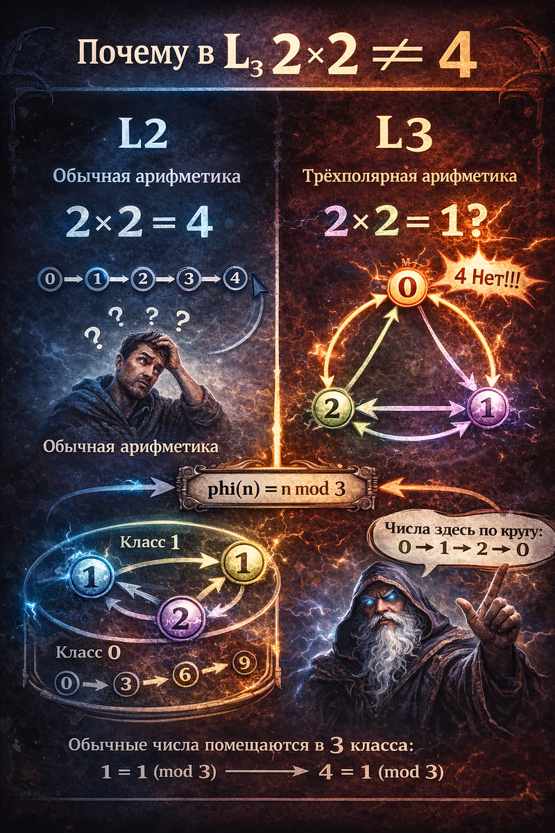 Тут‑то и кроется разгадка. В L3 любая операция обязана выдать результат внутри набора {0, 1, 2}. Поэтому запись «2 × 2 = 4» в трехполярности — это не ошибка в вычислениях, а ошибка в самом подходе. Вы пытаетесь «вытащить» результат в привычный "плоский" L2‑мир и удивляетесь, что он туда не влезает.