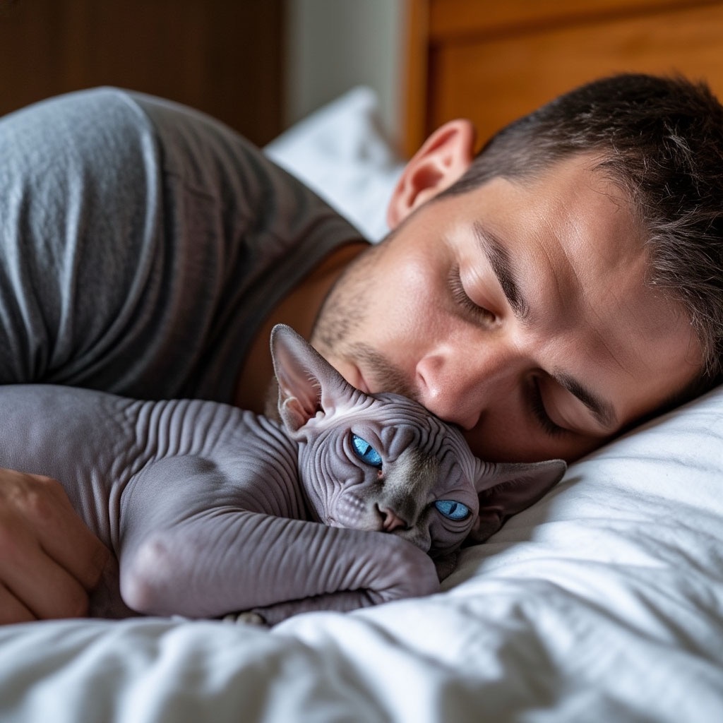Енн любит спать прямо у шеи или на затылке — иногда обнимает лапками, а Бан предпочитает уютное место в ногах. Это отражение их характера: Енн — активный и «обнимательный», Бан — спокойная и наблюдательная. 😄