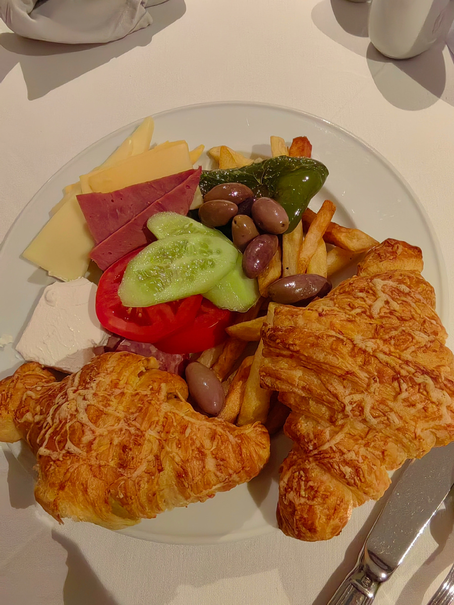 Это тарелочка моего диабетика- вкуснейшие круассаны,сыры, местное колбасное изделие со вкусом картона, оливки, картошка фри и даже свежие овощи.