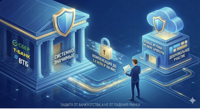 Участие брокеров в системе - добровольное. Механизм финансируется добровольными отчислениями профучастников, которые присоединились. Ваш Сбер или Т-Банк может вообще не участвовать и тогда выплат из этой системы не будет, если вдруг чего. Но что с ними случится - мы это уже обсудили.