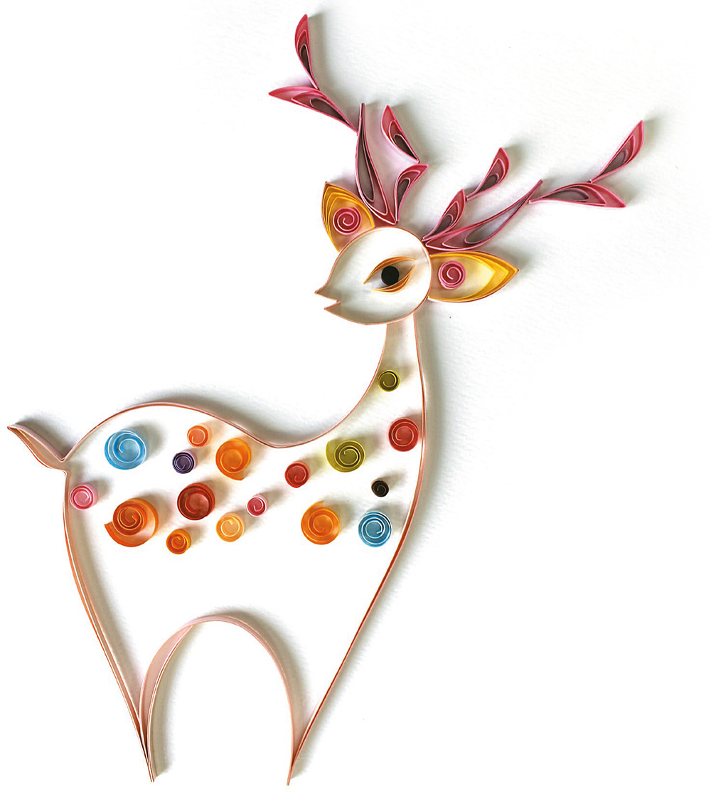 Наши статьи о квиллинге здесь. Сегодня создаём оленя, одного из самых благоприятных символов в китайской культуре. Олени в Китае ассоциируются с долголетием (живут якобы более двух тысяч лет) и достатком (звучание слова «олень» совпадает со словом «благосостояние»). Часто их изображают вместе с журавлями — ещё одним символом долгой жизни. Мы же превратим эту традицию в современный яркий квиллинг-проект с живыми линиями и насыщенными цветами. Для работы мы рекомендуем доступные материалы: подойдут бумажные полосы 3–5 мм шириной из наборов для квиллинга (или нарезанные самостоятельно из цветной офисной бумаги); картон белый 25 × 25 см; клей ПВА (канцелярский); инструмент для скручивания (квиллинг-перо или зубочистка/спица); пинцет (косметический); ножницы и линейка. Контур оленя и голова: розовые полосы — изогнутая линия