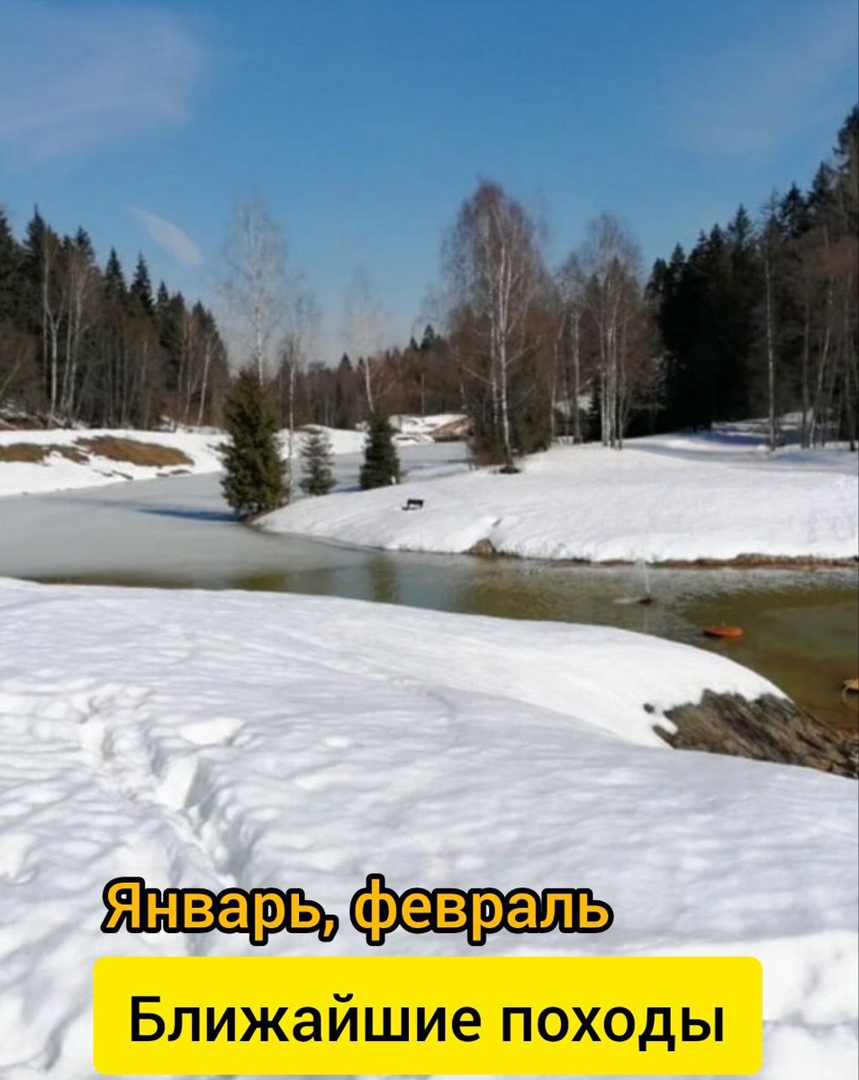 — 17 января: Лыжная прогулка в Пересвет — 24 января: Лыжный поход к Учинскому водохранилищу — 25 января: Мещерская симфония — 7 февраля: Поход в Арт-усадьбу — 8 февраля: Лыжная прогулка вдоль канала имени Москвы — 31 января — 1 февраля: Поход в этнопарк Кочевник с ночевкой в юртах — 14-15 февраля: Автотур в Кондуки зимой https://mycampinglife.ru/pohody-vyhodnogo-dnya-v-podmoskove/