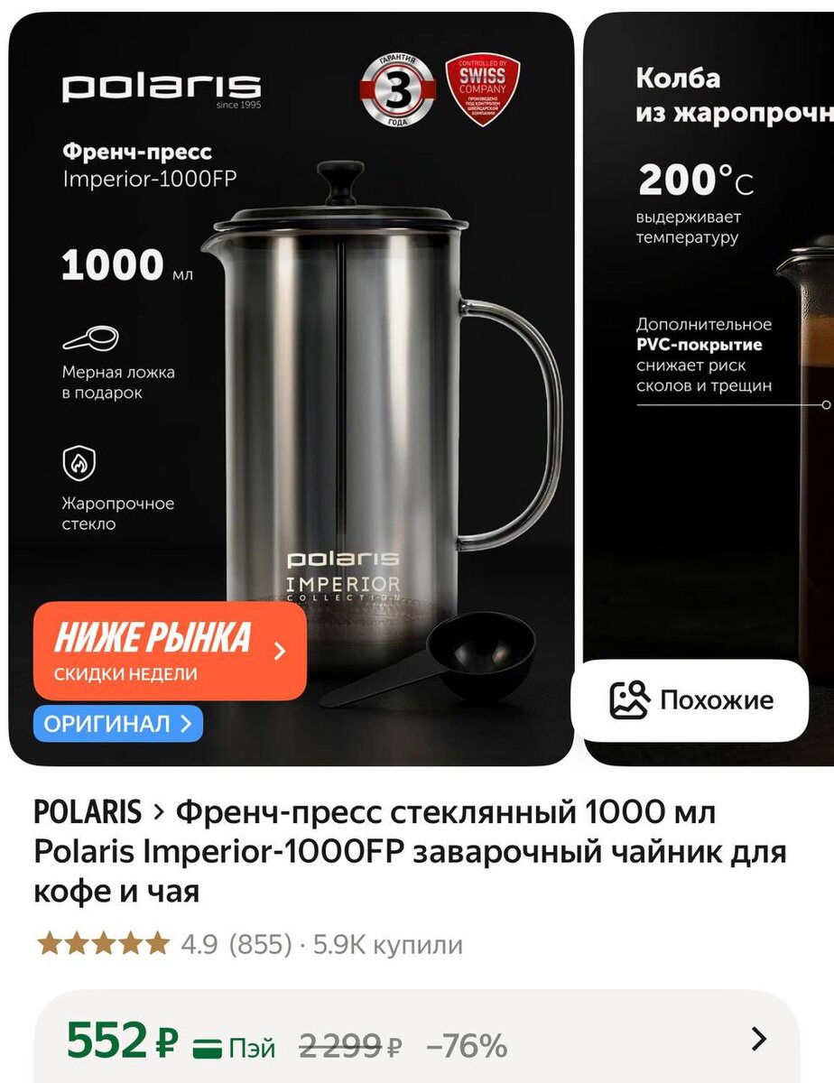 😲😲😄 Френч-пресс стеклянный 1000 мл Polaris Imperior-1000FP заварочный чайник для кофе и чая