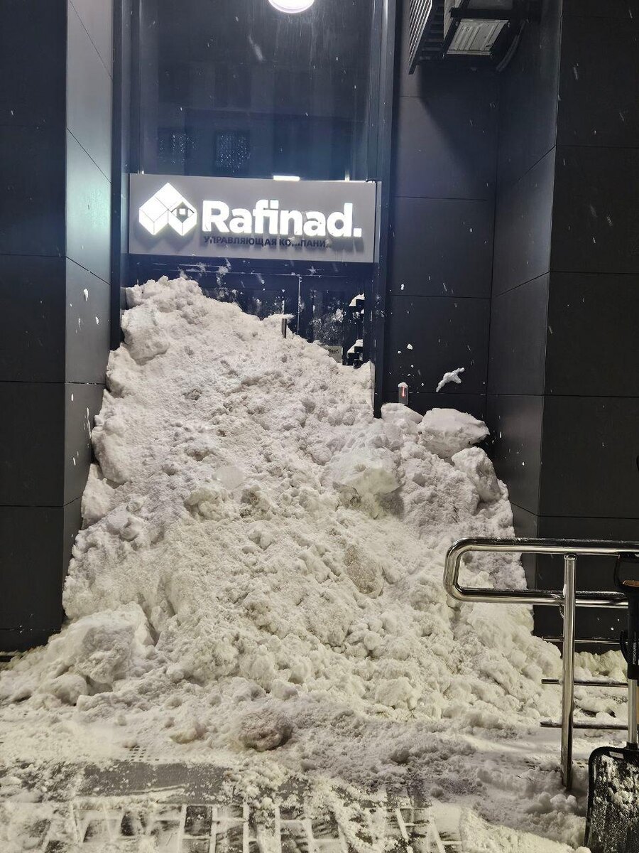 В ЖК Рафинад, что в Московской области, жители завалили снегом вход в офис УК, намекнув, что неплохо бы убраться во дворах.