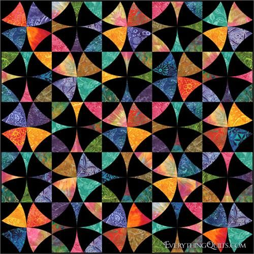 Добрый день, дорогие друзья. Мы, любители лоскутного шитья - люди с большой фантазией, поэтому часто придумываем собственные названия полюбившимся нам лоскутным дизайнам. В связи с этим частенько возникает недопонимание по поводу того, о каком же именно лоскутном блоке идет речь. Сегодня именно тот случай, когда все так и происходит. У лоскутной схемы, о которой я хочу поговорить с вами, есть много разных названий, и она очень красива! Вы можете называть ее, как вам больше нравится: "Деревенская площадь", "Колесо фортуны" или "Блок-цветок", а мы попробуем рассмотреть ее более внимательно. Основным "кирпичиком этой лоскутной красоты является вот такой небольшой элемент: По внешнему виду он действительно напоминает цветок и, наверное, благодаря этому сходству, в Российском сегменте интернета часто встречается под этим именем. Если сложить вместе много подобных элементов, то получается вот такая красота: В зависимости от того, как автор одеяла подбирает цвета, этот дизайн удивительно прео