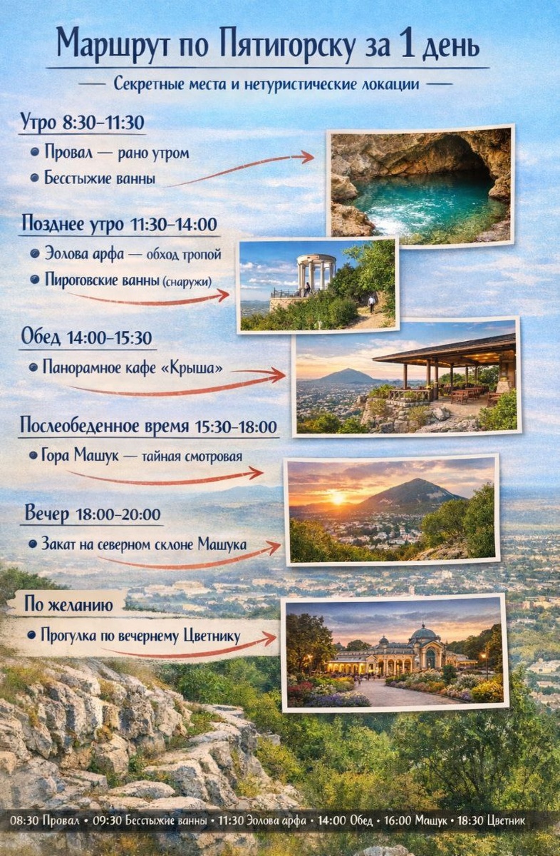 с нетуристическими и «секретными» местами Формат: пешком + немного такси. Подойдёт, если вы хотите прочувствовать город, а не просто «поставить галочки». ☀️ Утро | 8:30–11:30 1️⃣ Провал — без толп 📍 Приходите рано утром (до 9:30) • Туристы ещё спят • Голубая вода выглядит особенно красиво • Можно спокойно сделать фото без людей 👉 Секрет: от Провала пройдите не к парковке, а по тропе вверх — там открываются малоизвестные смотровые точки на Машук. 2️⃣ Бесстыжие ванны (дикие сероводородные источники) 📍 Пешком от Провала • Настоящее место «для своих» • Бесплатно • Купаются даже зимой 👉 Совет: возьмите купальник и полотенце в рюкзак. ⚠️ Не задерживайтесь долго (10–15 мин достаточно). 🌿 Позднее утро | 11:30–14:00 3️⃣ Эолова арфа — не с центрального входа • Обойдите по боковой тропе • Людей меньше, виды шире 👉 Секрет: пройдите чуть дальше по тропе — там лавочки с видом на весь Кавказский хребет, о которых не пишут в путеводителях. 4️⃣ Пироговские ванны (снаружи) 📍 Мимоходом • Очень атм