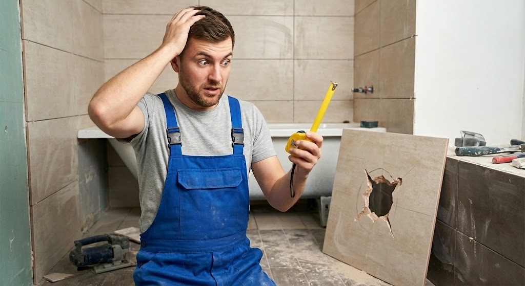 Здорово, работяги! С вами снова Александр Петрович. Знаете, что самое обидное в ремонте? Не цены (хотя о том, как купить плитку по цене склада, я вам в конце скажу, это мы решим). Самое обидное — это когда ты полчаса вымерял, сверлил, пыхтел, прикладываешь плитку к стене… а она не лезет! Я тут посмотрел, как новички мучаются с укладкой, и аж сердце прихватило. В одном видео парень сверлил отверстие под трубу. Померил — 40 см. Просверлил. Приложил — а там дыра в полпальца лишняя, или наоборот, на 5 мм не сходится . Оказалось — ошибка при чтении рулетки. 40,5 см принял за 40 . Итог: Плитка в мусорку. Время — коту под хвост. Чтобы вы не наступали на эти грабли, я собрал 5 главных ошибок, которые совершают 90% новичков. Читаем и мотаем на ус. Ошибка №1. Слепая вера в рулетку (и в себя) Семь раз отмерь — это не поговорка, это инструкция по выживанию. Когда вы размечаете отверстия под розетки или трубы: Ошибка №2. «Потом помою» Вы прижали плитку, вставили клинья, клей вылез из шва. Вы ду