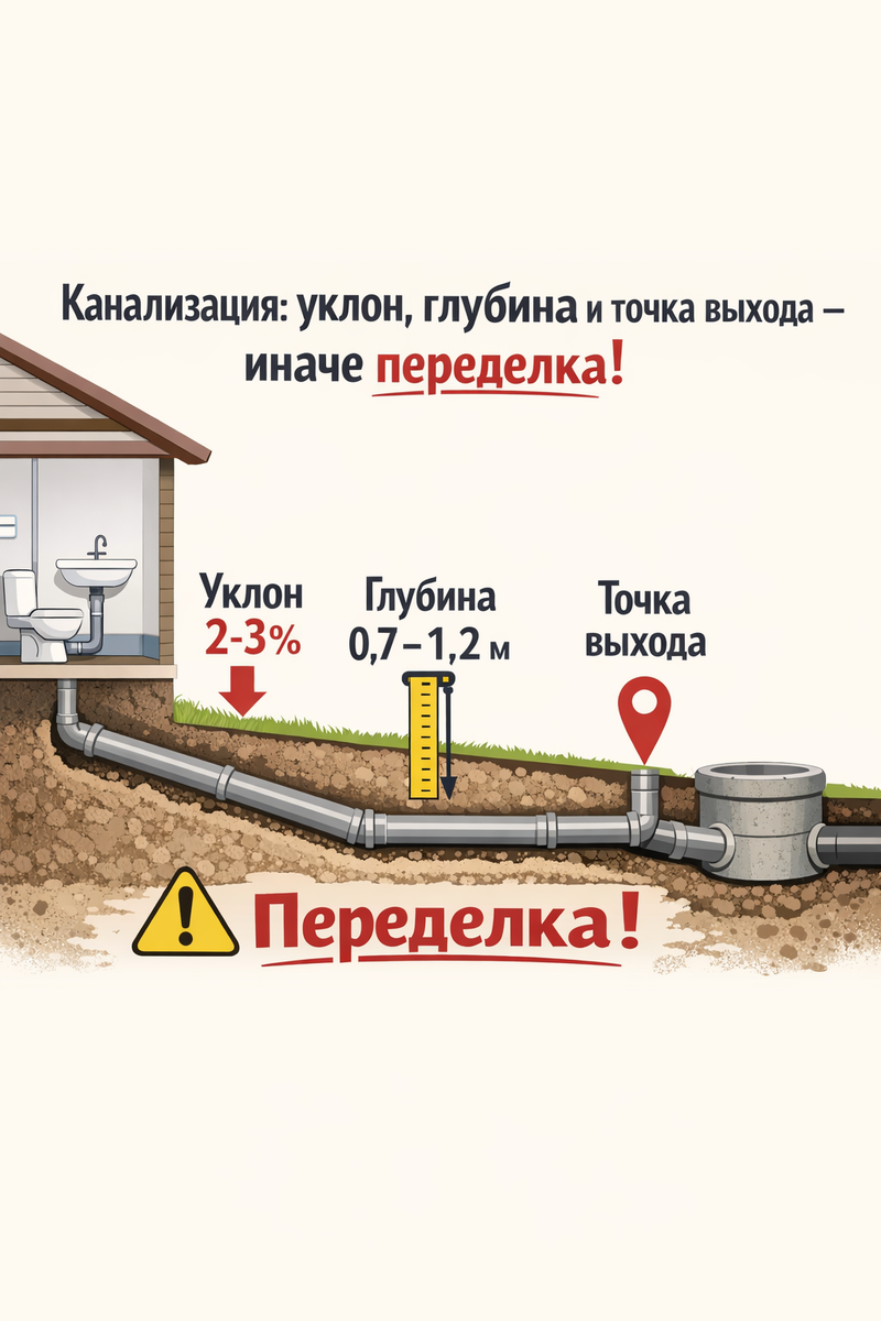 🚽 Канализация: уклон, глубина и точка выхода — иначе будет переделка