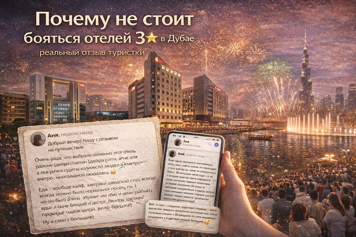 3, а еще хуже 2★ часто вызывают сомнения: «а не будет ли тесно», «как с едой», «нормально ли там вообще жить». Спойлер - не стоит ориентироваться на звезды. Разберём это на примере реального опыта туристки, которая летала в Дубай — на Новый год. Вылет был запланирован на 1 января 2026 года, поэтому саму новогоднюю ночь туристка провела в аэропорту. Такой формат поездки часто выбирают сознательно: И, как показала поездка, это никак не ухудшило впечатления от отдыха. Посмотрим, какой будет еще следующий год. Ведь как говорят - как год встретишь, так и проведешь! Перед бронированием рассматривались два отеля одной сети — Ibis Deira Creekside Dubai и Ibis Al Rigga.