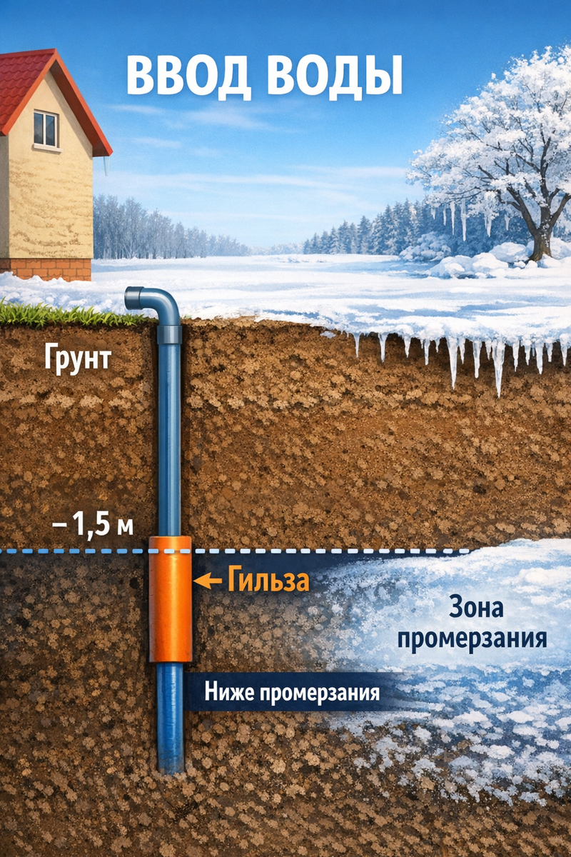💧 Ввод воды: где ставить гильзу, чтобы зимой не замёрзло