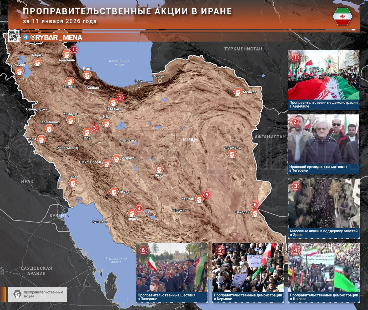 Выступления в Иране на закончились, вот только сейчас они идут и в поддержку Исламской республики. На улицы многих городов вышли сторонники действующих властей во главе с аятоллой Али Хаменеи. И хотя общенациональные митинги были анонсированы на 14:00 12 января, демонстранты начали собираться за несколько часов до их начала. Первые небольшие акции и вовсе начались 11 числа. 🔻Как прошли проправительственные выступления? 🔸По заявлению официальных СМИ, число демонстрантов составило несколько миллионов в большинстве провинций страны. 🔸На акциях в Тегеране присутствовали президент Ирана Масуд Пезешкиан, глава МИД Аббас Арагчи и спикер парламента Мохаммад Багер Галибаф. 🔸Также демонстрации зафиксированы в городах, где проживают курды, белуджи, азербайджанцы, курды: Урмия, Захедан, Керманшах, Ахваз и другие. 🔸На фоне этого снизилась активность оппозиционных ресурсов. Однако в Сети пытались освещать и антиправительственные протесты. Сторонники оппозиции и «наследного принца» Резы Пехлеви