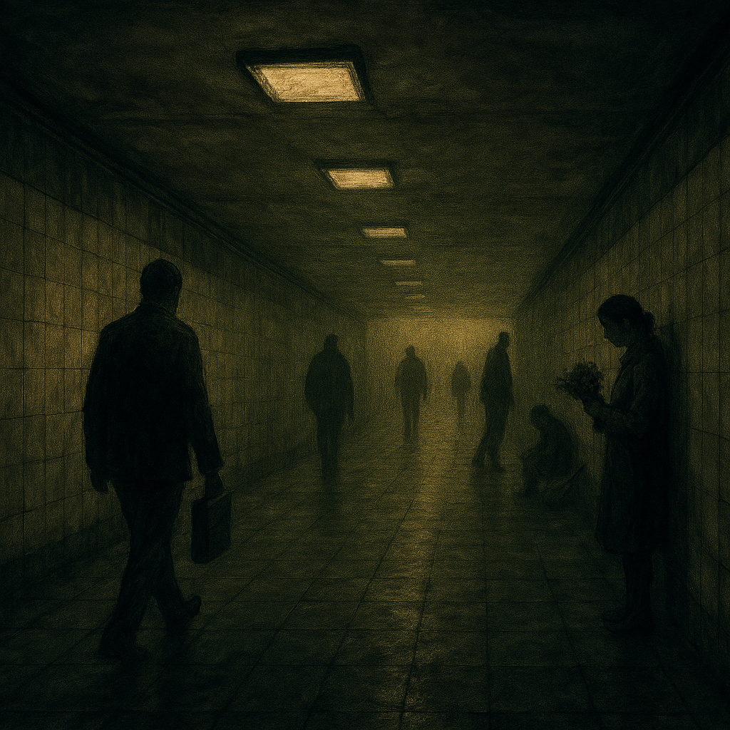 Я прохожу через этот подземный переход почти каждый день. Иногда утром, иногда вечером, иногда просто потому, что так короче. Он не меняется. Те же стены, те же плитки, те же лампы, которые светят не ярко, а как будто извиняясь. Здесь всегда немного пахнет сыростью и шагами, смесью мокрой обуви, пыли и времени. Люди в переходе не задерживаются. Здесь не живут, не разговаривают, не смотрят друг другу в глаза. Здесь проходят. И всё же именно здесь я вижу людей дольше, чем где бы то ни было. Годами. Одних и тех же. Я знаю мужчину, который всегда идёт быстро. Он появляется слева, почти бегом, с портфелем, прижатым к боку. Он никогда не смотрит по сторонам. Его взгляд направлен вперёд, как будто переход – это не место, а препятствие. Я видел его зимой, летом, в дождь, в снег. Однажды его не было несколько недель. Когда он появился снова, он шёл медленнее. Я заметил это сразу. У стены почти всегда стоит женщина с цветами. Она не продаёт их громко, не зазывает. Просто стоит. Иногда смотрит в