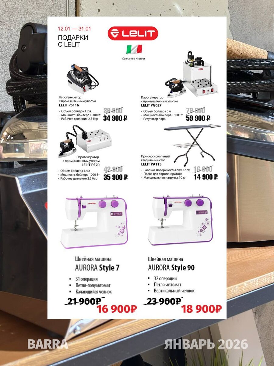 Горячие предложения на парогладильную технику LELIT: 💨Парогенератор с утюгом Lelit PS 11N - 34 900₽ вместо 39 900₽, 💨Парогенератор с утюгом Lelit PS 20 - 35 900₽ вместо 42 900₽, 💨Парогенератор с утюгом Lelit PG 027 - 59 900₽ вместо 79 900₽ 💨 Гладильный стол PA 113 - 14 900₽ вместо 16 900₽, И машины Aurora с приятной скидкой: 🔸Aurora Style 7 швейная машина - 16 900₽ вместо 21 900₽, 🔸Aurora Style 90 швейная машина - 18 900₽ вместо 23 900₽. Ждём вас на тест-драйв и за покупками! Наш сайт BARRA.PRO 🎁 Бесплатная доставка оборудования до дверей вашего дома; 🤳 Онлайн консультация, если вы далеко; 📲 Телефон для связи +7 920 413-25-83 телеграм, макс, 🔄 Трейд-ин: с выгодой обменяем вашу старую технику на новую* 👛 Рассрочка и кредит; BARRA, г. Воронеж, ул. Средне - Московская 5 📌