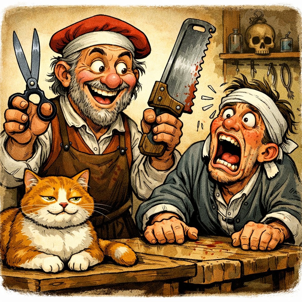 Эту нишу и заняли цирюльники-хирурги (barber-surgeons). Их инструменты были просты и универсальны: бритва для бритья и вскрытия вен, ножницы для стрижки волос и перевязочного материа