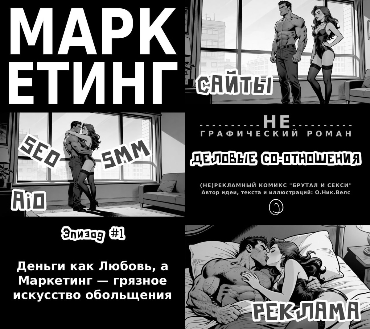 Маркетинг — грязное искусство обольщения *** (не)РЕКЛАМНЫЙ КОМИКС "БРУТАЛ И СЕКСИ" (не)ГРАФИЧЕСКИЙ РОМАН: "ДЕЛОВЫЕ СО-ОТНОШЕНИЯ" Автор идеи, текста и иллюстраций: О.Ник.Велс. *** В полутёмном офисе, где сигаретный дым смешивается с амбициями, встречаются двое. Он — грубый бизнесмен на грани банкротства. Она — коварная соблазнительница от мира маркетинга. Когда их компания катится в пропасть, они затевают опасную игру. Она учит его искусству продаж, сравнивая это с грязным соблазнением. Он сопротивляется, но её методы слишком эффективны, чтобы их игнорировать. Граница между бизнесом и страстью размывается. Они готовы на всё, чтобы спасти компанию. Но кто кого в итоге использует? И чем закончится эта опасная игра, где ставки выше, чем кажется? Остаётся только одно — наблюдать за тем, как в мире больших денег рождается самый грязный маркетинг в истории. Читать здесь: https://author.today/post/768378 *** P.s. Прошу этот экспериментальный рекламный комикс-проект не судить строго и воспри