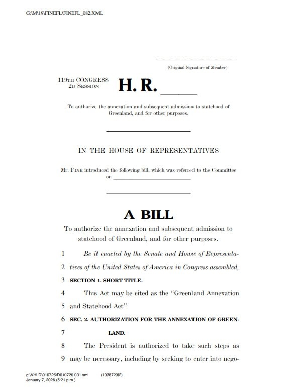 национальной безопасности США. Сейчас в Вашингтоне 15:30. На сайте Конгресса документ пока не зарегистрирован, но текст уже опубликован на сайте самого Файна (прикрепляю). Там всё предельно коротко: «аннексировать» Гренландию или «иным способом приобрести Гренландию в качестве территории Соединённых Штатов». Сам Файн — конгрессмен «молодой» и по возрасту, и по политическому опыту на федеральном уровне: 52 года, в Конгрессе меньше года (с апреля 2025). До этого — около 10 лет, по-нашему, депутат регионального парламента. За неполный год он успел внести 22 законопроекта, среди которых: «Запретить иностранцам получать федеральные государственные пособия», «Против антисемитизма в Европе», «Запрет на антисемитизм в школах», «Закон о совместных исследованиях ПТСР между США и Израилем», «О признании Совета по американо-исламским отношениям террористической организацией». По всей видимости, это тамошний американский хайпожор. Вроде наших доморощенных. Вы бы стали относиться серьёзно к зако