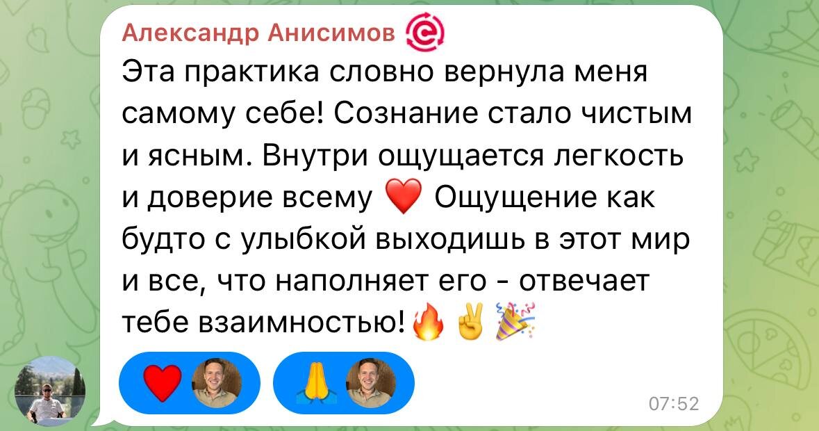 Сегодня мощная практика получилась. Начали снимать контент совместный с любимой, что не делали уже достаточно давно. Сегодня принял решение разговаривать на Английском и договорился с соседом учителем, со времен университета не учил Английский. Моя задача начать говорить. Помимо этого, день прошёл максимально активно и насыщенно. Так как практика была на любящую доброту, то чувствовал открытое сердце и чувствовал на протяжении дня. Завтра в 07:00 мск будет практика здесь, приглашаю тебя она доступна в прямом эфире. Только включи VPN, если ты из России.