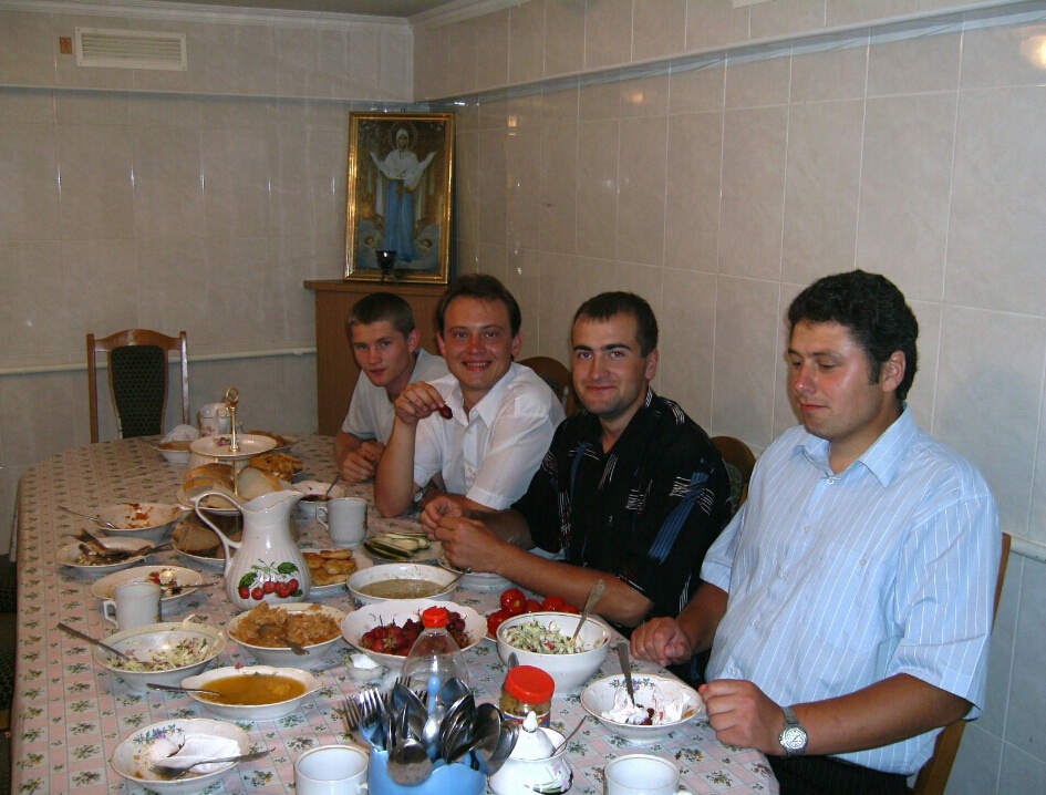 ПРО ФОТО: в одной из трапез Резиденции Главного в УПЦ, второго по чести в РПЦ, Митрополита Киевского, Главы и Киевской Митрополии (Области), База которой в этой Резиденции, она в Лавре. Это трапезная Канцелярии, а Канцилярия и Митрополии и УПЦ в целом (как Патриарх это Глава Московской Патриархии и РПЦ в целом, всё это епископы, смотрящие, каждый в своей вотчине, юрлиц УПЦ, РПЦ, БПЦ... нет, поэтому их закрыть невозможно, что досада лукавому, всё, как Бог отцов, Христос прописал, Его Дело, Владыки вселенной, у ног Твоих), что в 49-м корпусе, есть трапезные в 70-м (там и нынешний Главный жил, но сейчас его выселил Бандера, которому бальзам на сердце песни про Украину на Руси) и в 71-м есть трапезная. Был ещё флигель у Резиденции рядом с ней, кажется 60-й корпус, я не в курсе, хотя прожил в нём 9 лет, так как нумерация корпусов это дело и Музейной государственной советской власти и Монастыря, например, 70-м стал бывший детский сад, туда и переехал из 49-го Митрополит, все подробности писали. Вот пришёл кушать вместе с семинаристами и академистами, работавшими на территории Резиденции под моим руководством, моим основным делом там было - сидеть в келии и писать, о чём мало кто знал, все свои труды Митрополиту передавал, так "само по себе" сложилось, все подробности писали. Про дату и время снимка скрин добавили в папку "Про другое", ссылка на Таплинке. Кушать в Резиденции готовили послушницы Покровского монастыря, в километрах 7-ми от Лавры. Туда сдали родители-россияне Аню, которой предложение сделал, так Бог сказал. Сделал и продолжил заниматься своим делом, подробности писали.