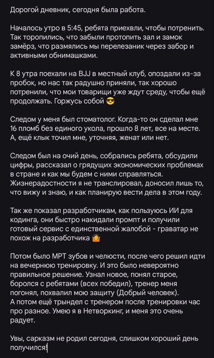 Началось утро в 5:45, ребята приехвли, чтобы потренить. Так торопились, что забыли протопить зал и замок замёрз, что размялись мы перелезаник через забор и активными обнимашками. К 8 утра поехали на BJJ в местный клуб, опоздали из-за пробок, но нас так радушно приняли, так хорошо потренили, что мои товарищи уже ждут среду, чтобы ещё продолжать. Горжусь собой 😎 Следом у меня был стоматолог. Когда-то он сделал мне 16 пломб без единого укола, прошло 8 лет, все на месте. А, ещё клык точил мне, уточняя, женат или нет. Следом был на очий день, собрались ребята, обсудили цифры, рассказал о грядущих экономических проблемах в стране и как мы будем с ними справляться. Жизнерадостности я не транслировал, доносил лишь то, что вижу и знаю, и как планирую вести дела в этом году. Так же показал разработчикам, как пользуюсь ИИ для кодинга, они быстро накидали промпт и получили готовый сервис с единственной жалобой - граватар не похож на разработчика 🤷 Потом было МРТ зубов и челюсти, после чег