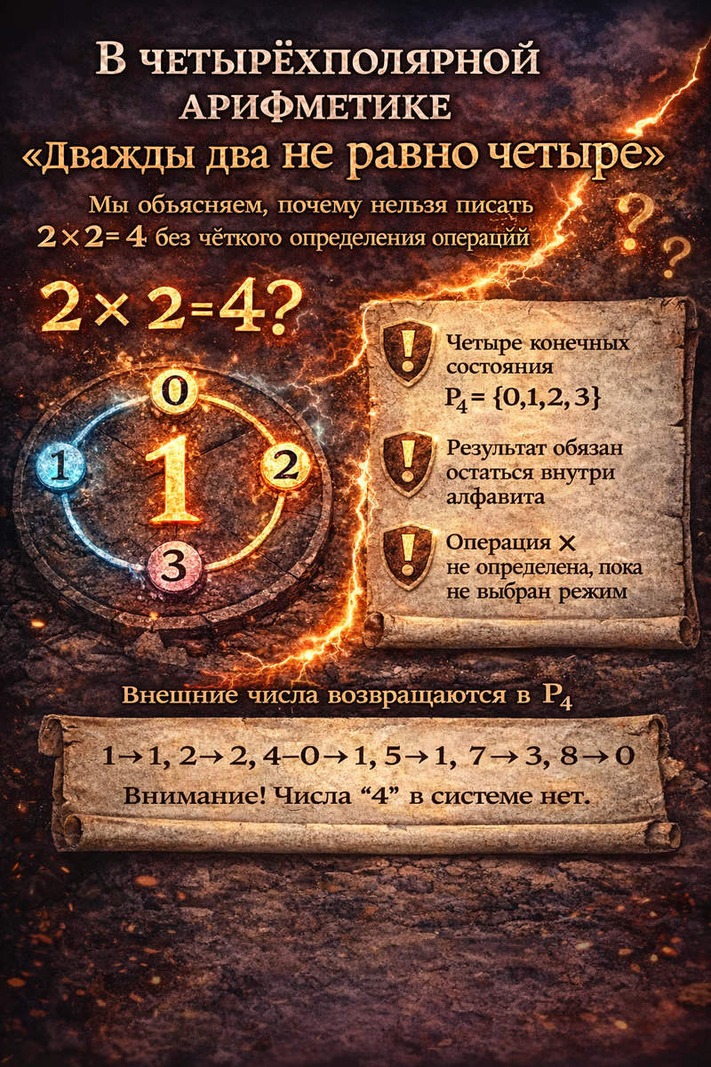 Фраза «в четырёхполярной арифметике дважды два не равно четыре» звучит как провокация, бросающая вызов привычным представлениям. Однако при строгом анализе становится ясно: сама постановка вопроса некорректна до тех пор, пока не определены базовые правила вычислений в этой системе. Сначала я поясню суть на простом примере, чтобы снять первые вопросы интуитивного непонимания. Затем изложу всё строго математически — с точными определениями и безупречной логикой выводов.