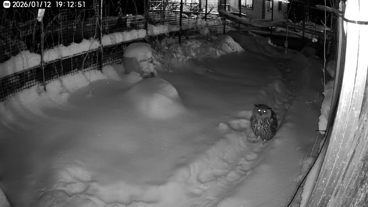 Сова филин Ёль активно пользуется тропинкой в глубоком снегу, которую я проложила после сильного снегопада.