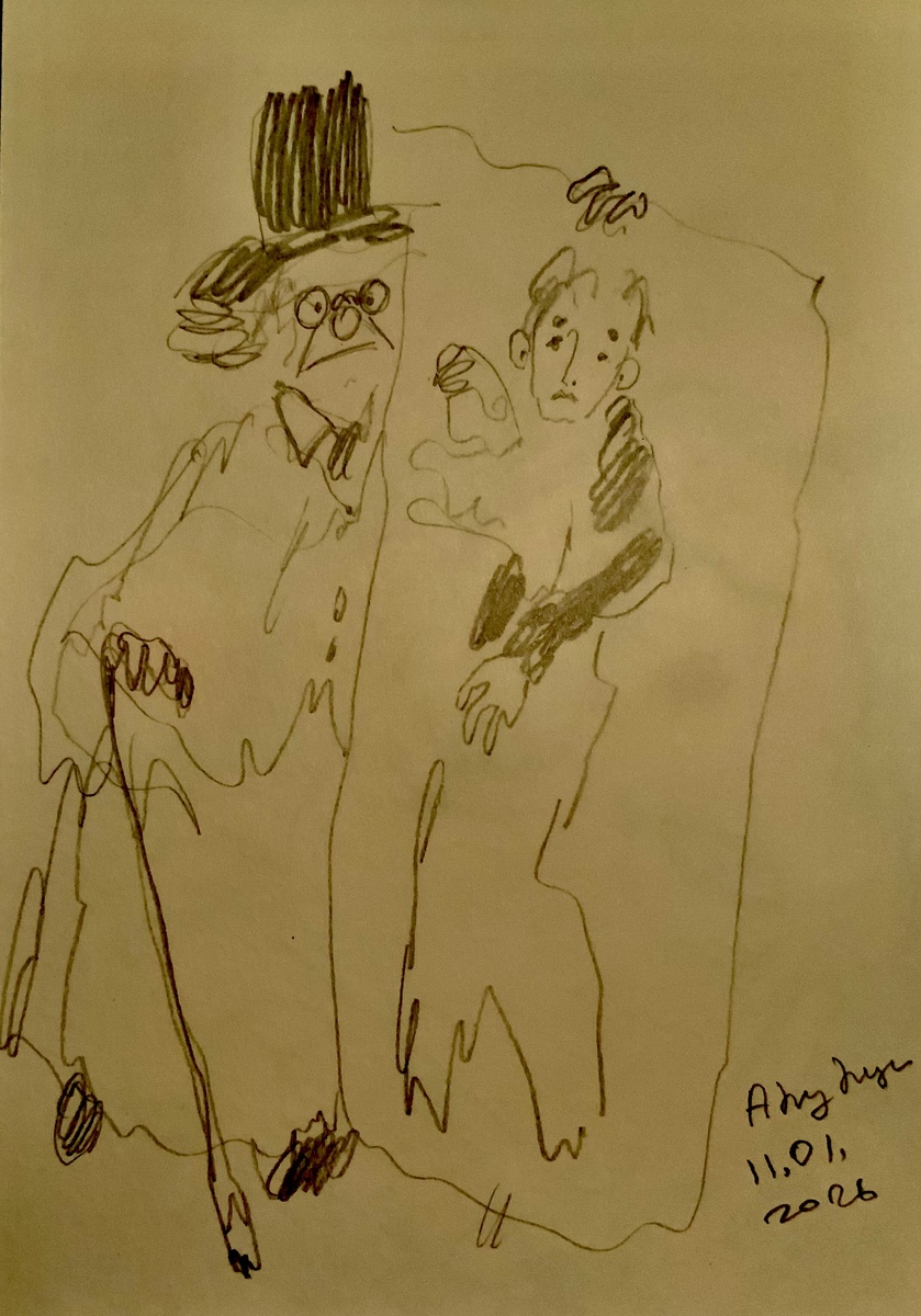 Это иллюстрация к фильму «Кабинет доктора Калигари» режиссера Роберта Вине: Фильм вышел на экраны кинотеатров в феврале 1920 года, т.е. ему почти 126 лет! Фильм снят в жанре психологического хоррора и выполнен в стиле немецкого экспрессионизма. Как на моей иллюстрации, так и на постере изображены Вернер Краусс в роли собственно доктора Калигари и Конрад Фейдт в роли Чезаре, его «сомнамбулы». Чезаре — то ли человек, то ли кукла, которым Калигари манипулирует, заставляя его совершать преступления. Лишь однажды Чезаре отказался от совершения преступления, пощадив девушку Джейн — невесту Франсиса, еще одного героя фильма И вот Франсис начинает что-то подозревать, он хочет узнать правду. Ему кажется странным, что такой зависимый человек, как Чезаре, который, к тому же, все время спит, мог додуматься до таких преступлений, и начинает подозревать в чем-то самого Калигари. Но когда «туман» рассеивается, сон проходит, выясняется, что Франсис сошел с ума, все это ему только привиделось, а Калига