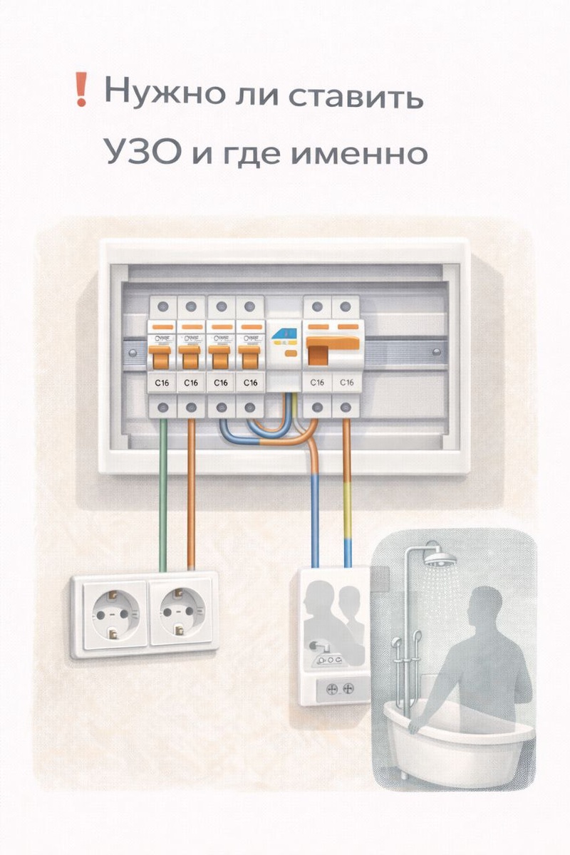 При монтаже электропроводки УЗО — не «лишняя трата», а обязательный элемент безопасности. Оно защищает человека, а не технику. ❗ Частая ошибка — ставить УЗО одно на всю квартиру или не ставить вовсе. ✅ Где УЗО обязательно: Ванная комната Кухня Розеточные группы Стиральная и посудомоечная машина Ввод в квартиру (общее противопожарное УЗО) ⚙️ Рекомендуемые номиналы: Розеточные группы — 30 мА Ванная, кухня — 30 мА Вводное (пожарное) — 100 мА По току — на ступень выше автомата 🔧 Важно помнить: УЗО не защищает от короткого замыкания — перед ним всегда должен стоять автомат Один УЗО на всю квартиру = сложно искать утечку Лучшее решение — дифавтоматы или несколько УЗО по группам ⚠️ Чего не делать: Не объединять ноль после УЗО Не ставить УЗО без заземления Не экономить на бренде ⚡ Вопросы и сотрудничество: Telegram: @help_electrik WhatsApp: +7 967 110-14-11 🌐 Сайт: https://electrik-clge.vercel.app/